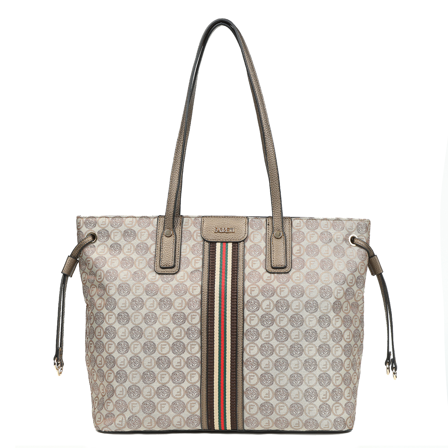 Вместительная дорожная сумка FABRETTI в бежевом оттенке декорирована узором в стиле "Логомания". Материал изделия состоит из двух слоев: нижний слой из экокожи, верхний - из жаккарда. Двухслойный материал - это текстильное волокно, дублированное с высококачественным полиуретаном посредством термической обработки. Сумка закрывается на молнию. Внутри 3 боковых кармана для мелочей: 2 открытых и на молнии. Лицевая сторона украшена контрастной текстильной лентой. На тыльной стороне расположен карман быстрого доступа на молнии. Дно сумки защищают 4 металлические ножки. Удлиненные ручки шириной 1 см позволяют комфортно носить изделие на плече или в руках. Цвет фурнитуры - золото.