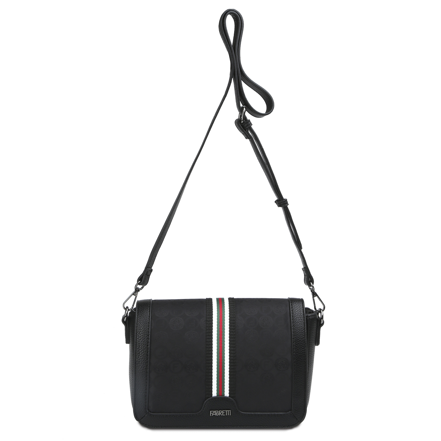 Компактная кросс-боди FABRETTI в черном цвете декорирована узором в стиле "Логомания". Материал изделия состоит из двух слоев: нижний слой из экокожи, верхний - из жаккарда. Двухслойный материал — это текстильное волокно, дублированное с высококачественным полиуретаном посредством термической обработки. Сумка закрывается клапаном с магнитной кнопкой. Основное отделение на молнии. Внутри 2 боковых кармана для мелочей: открытый и на молнии. Клапан украшен контрастной текстильной лентой. На тыльной стороне расположен карман быстрого доступа на молнии. Съемный плечевой ремень регулируется по длине, ширина - 1,5 см. Цвет фурнитуры - черный.