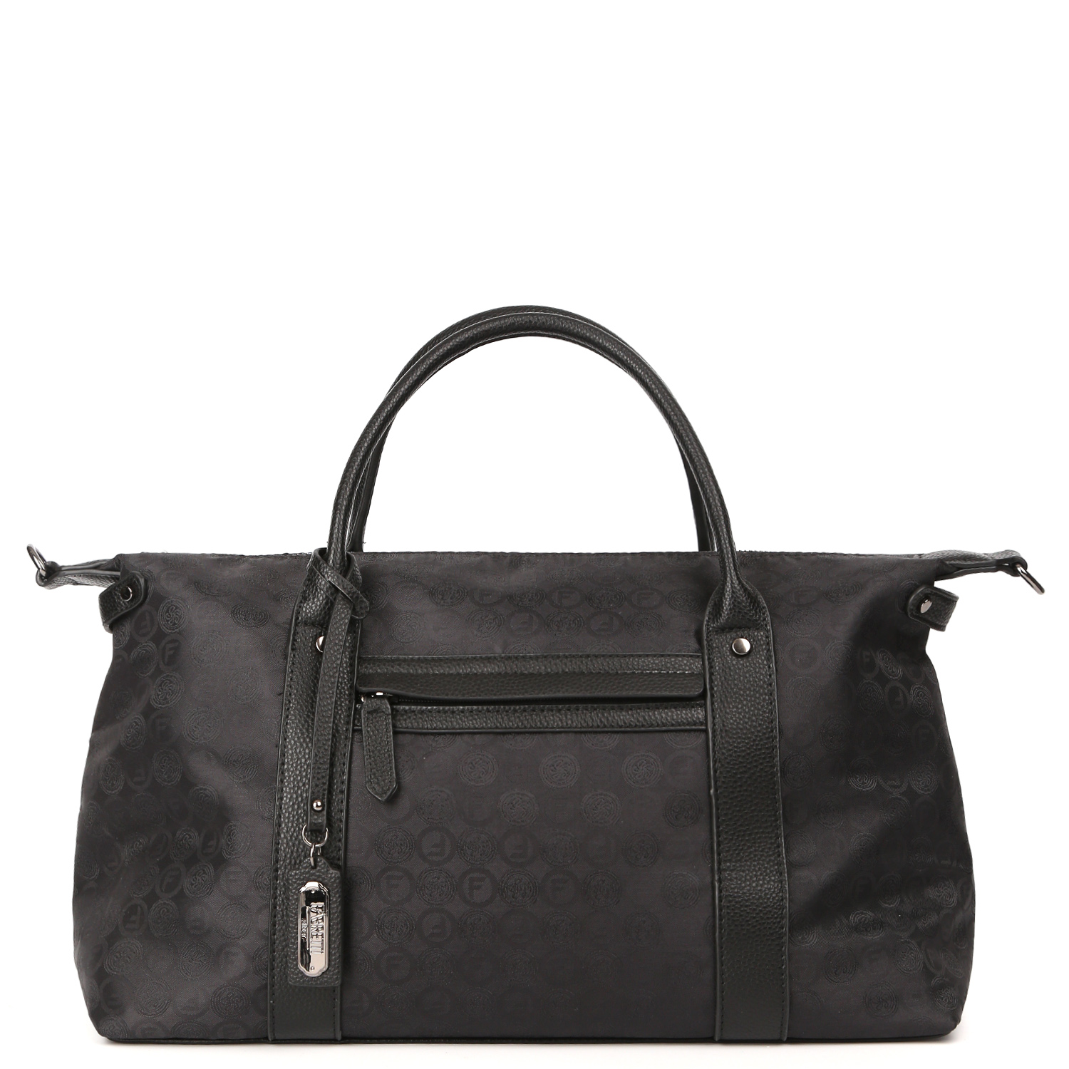 Компактная дорожная сумка FABRETTI в черном цвете декорирована узором в стиле «Логомания». Сумка выполнена из высокотехнологичного полиэстера с текстурой жаккард, устойчивого к воздействию влаги и перепаду температур.  Сумка отлично подойдет для поездки на выходные и вместит самые необходимые вещи для короткого путешествия. Просторное отделение закрывается на молнию. Внутри 3 боковых кармана для мелочей: 2 открытых и на молнии. На лицевой стороне расположен карман быстрого доступа на молнии. Ручки, дно и другие элементы отделки выполнены из экокожи. В комплект входит съемный плечевой ремень, длина которого регулируется, ширина - 4 см. Цвет фурнитуры - черненый никель.