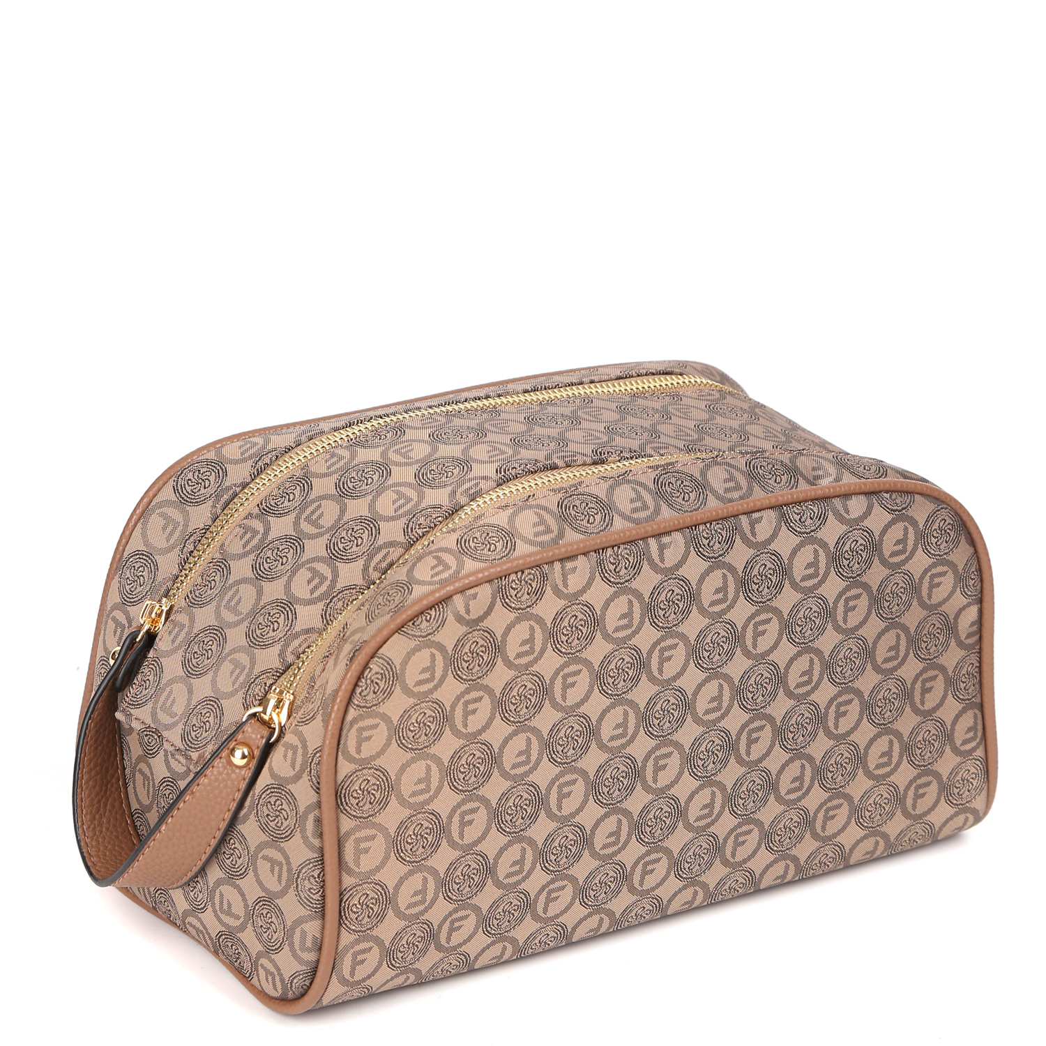 Дорожная косметичка FABRETTI в коричневом оттенке декорирована узором в стиле "Логомания". Двухслойный материал сумки - это текстильное волокно с фактурой жаккард, дублированное с высококачественным полиуретаном посредством термической обработки. Просторное отделение закрывается на двойную молнию. Внутри 2 боковых кармана для мелочей: открытый и на молнии. Удобная ручка позволяет комфортно носить аксессуар в руке. Цвет фурнитуры - золото.