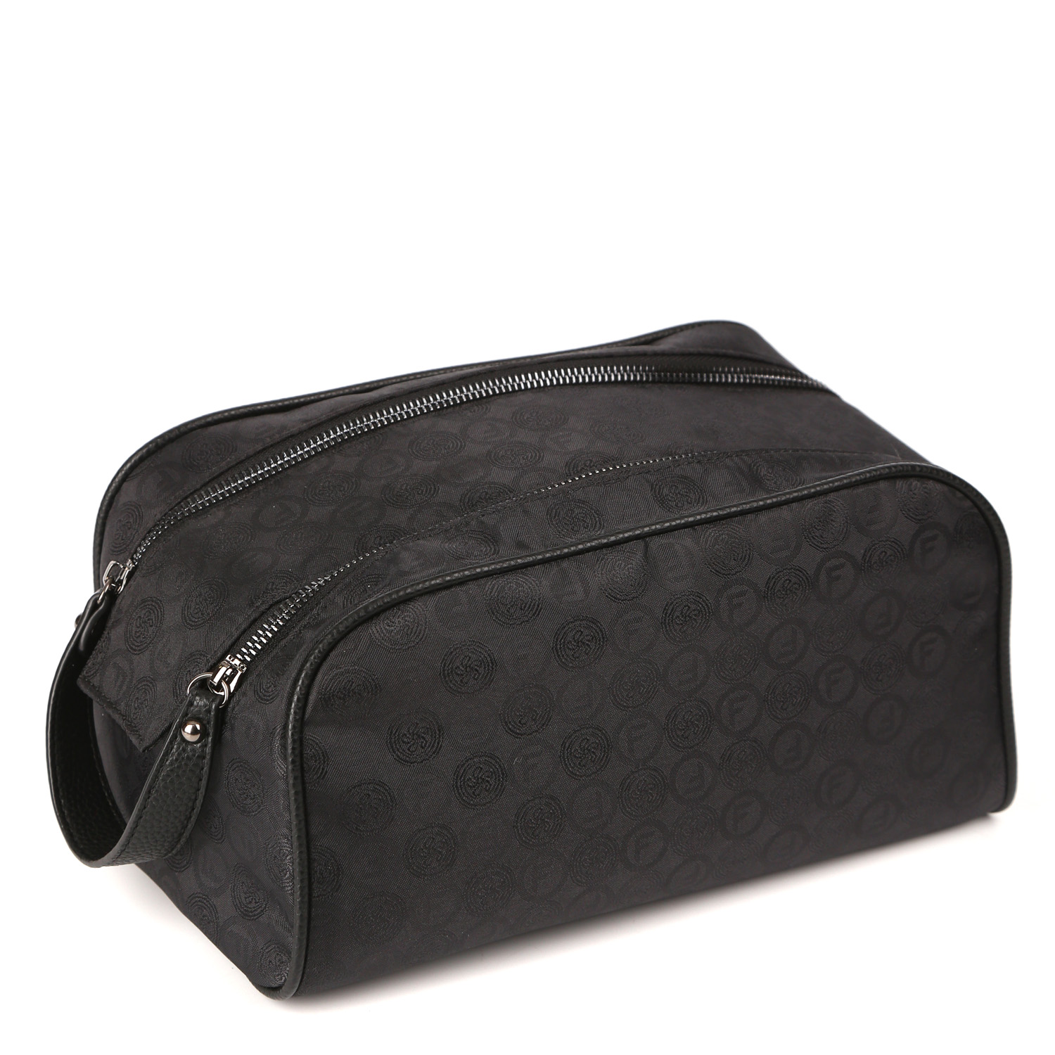 Дорожная косметичка FABRETTI в черном цвете декорирована узором в стиле "Логомания". Двухслойный материал сумки - это текстильное волокно с фактурой жаккард, дублированное с высококачественным полиуретаном посредством термической обработки. Просторное отделение закрывается на двойную молнию. Внутри 2 боковых кармана для мелочей: открытый и на молнии. Удобная ручка позволяет комфортно носить аксессуар в руке. Цвет фурнитуры - черненый никель.