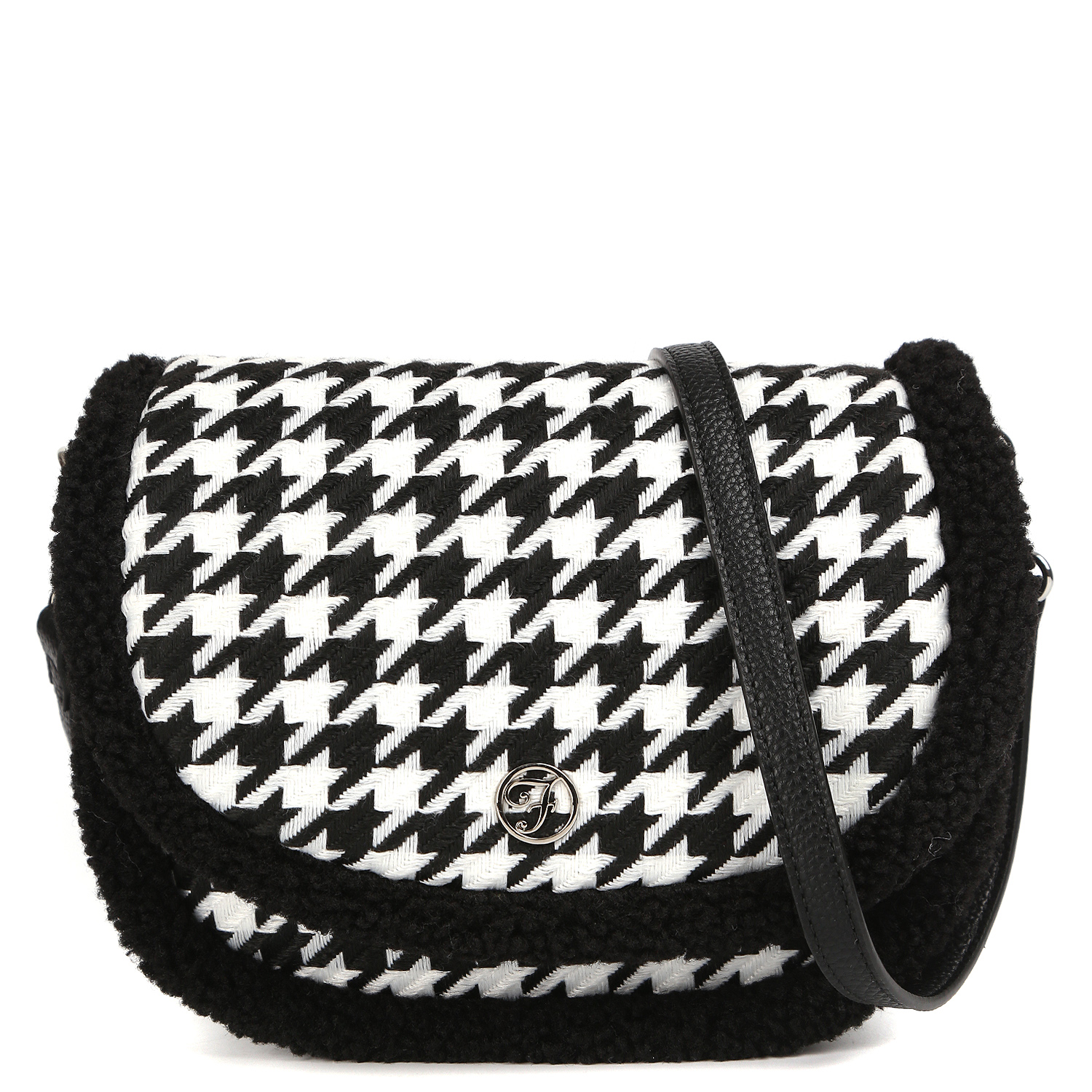 Компактная кросс-боди FABRETTI выполнена из экокожи в черном цвете и текстильной вставкой из твида с узором «гусиная лапка».  Внешние края декорированы искусственным мехом под овчину. Аксессуар закрывается на клапан с магнитной кнопкой. Внутри 2 боковых кармана для мелочей: открытый и на молнии.  Дополняет дизайн плечевой ремень, регулируемый по длине, ширина - 1,5 см. При необходимости его можно снять, и кросс-боди станет стильным клатчем. Цвет фурнитуры - серебро.