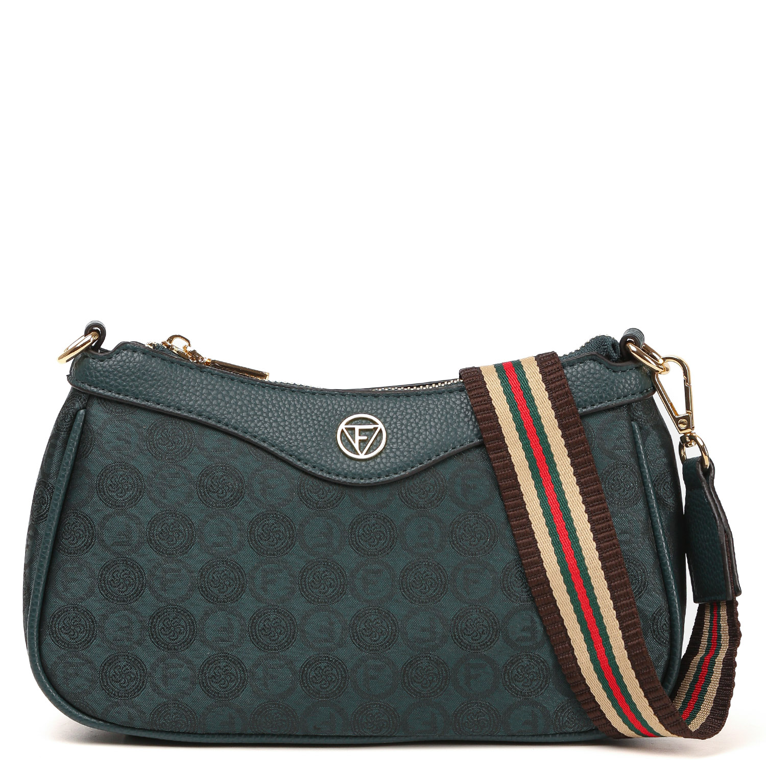 Компактная кросс-боди FABRETTI в зеленом оттенке декорирована узором в стиле "Логомания". Двухслойный материал сумки - это текстильное волокно с фактурой жаккард, дублированное с высококачественным полиуретаном посредством термической обработки. Основное отделение закрывается на молнию. Внутри есть 2 кармана для мелочей: открытый и на молнии. На лицевой стороне расположен карман быстрого доступа на молнии. Съемный плечевой ремень регулируется по длине, ширина - 3,5 см. Цвет фурнитуры - золото.
