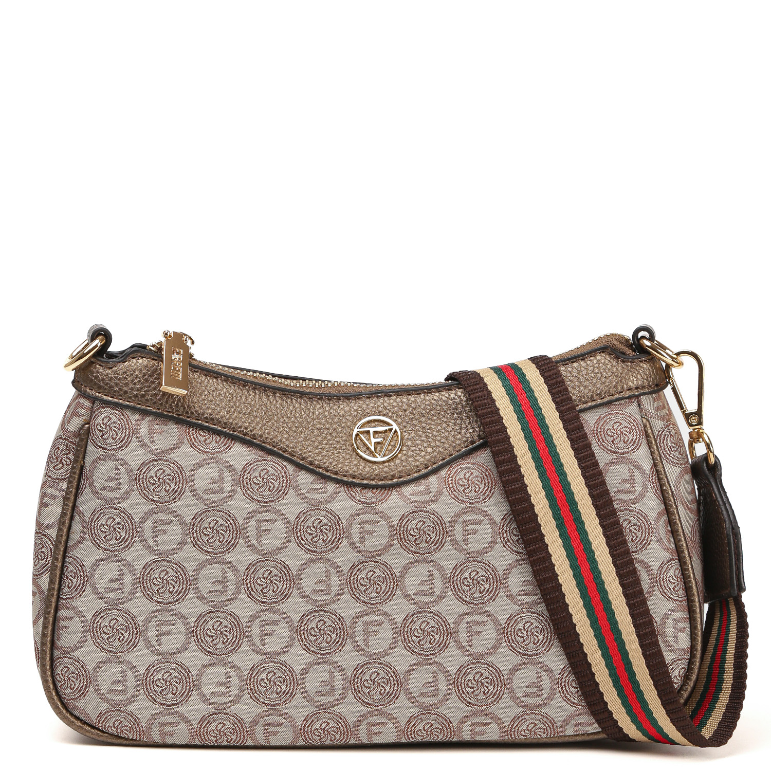 Компактная кросс-боди FABRETTI в бежевом оттенке декорирована узором в стиле "Логомания". Двухслойный материал сумки - это текстильное волокно с фактурой жаккард, дублированное с высококачественным полиуретаном посредством термической обработки. Основное отделение закрывается на молнию. Внутри есть 2 кармана для мелочей: открытый и на молнии. На лицевой стороне расположен карман быстрого доступа на молнии. Съемный плечевой ремень регулируется по длине, ширина - 3,5 см. Цвет фурнитуры - золото.
