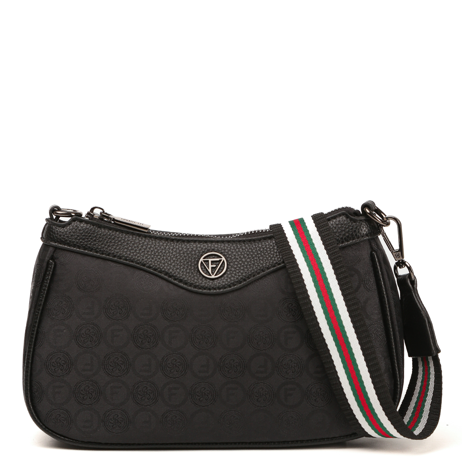 Компактная кросс-боди FABRETTI в черном цвете декорирована узором в стиле "Логомания". Двухслойный материал сумки - это текстильное волокно с фактурой жаккард, дублированное с высококачественным полиуретаном посредством термической обработки. Основное отделение закрывается на молнию. Внутри есть 2 кармана для мелочей: открытый и на молнии. На лицевой стороне расположен карман быстрого доступа на молнии. Съемный плечевой ремень регулируется по длине, ширина - 3,5 см. Цвет фурнитуры - черненый никель.