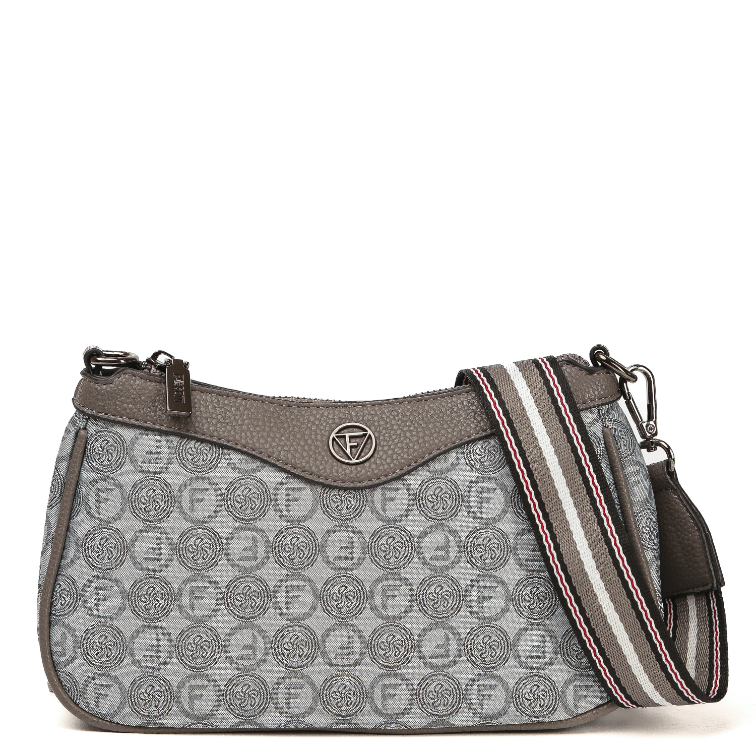Компактная кросс-боди FABRETTI в сером оттенке декорирована узором в стиле "Логомания". Двухслойный материал сумки - это текстильное волокно с фактурой жаккард, дублированное с высококачественным полиуретаном посредством термической обработки. Основное отделение закрывается на молнию. Внутри есть 2 кармана для мелочей: открытый и на молнии. На лицевой стороне расположен карман быстрого доступа на молнии. Съемный плечевой ремень регулируется по длине, ширина - 3,5 см. Цвет фурнитуры - черненый никель.