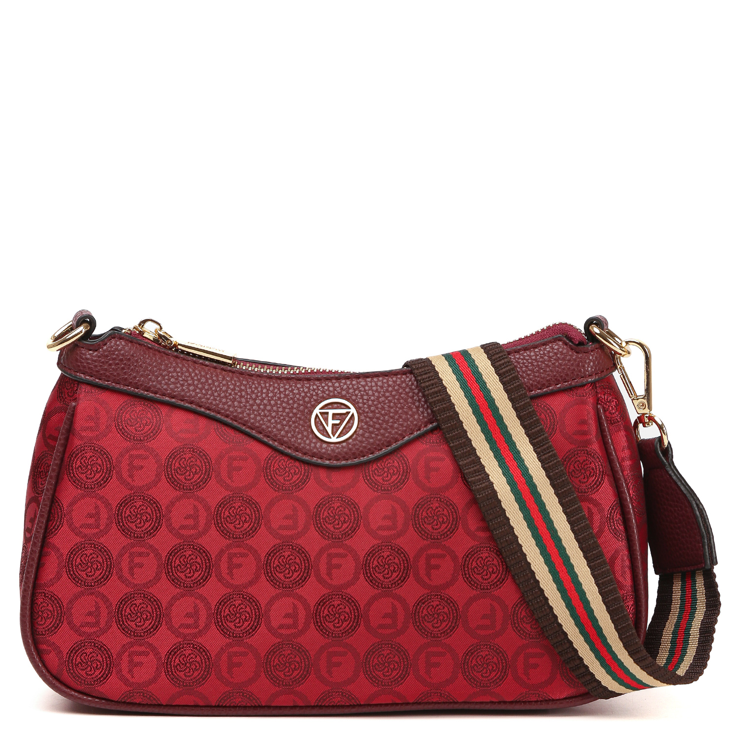 Компактная кросс-боди FABRETTI в красном оттенке декорирована узором в стиле "Логомания". Двухслойный материал сумки - это текстильное волокно с фактурой жаккард, дублированное с высококачественным полиуретаном посредством термической обработки. Основное отделение закрывается на молнию. Внутри есть 2 кармана для мелочей: открытый и на молнии. На лицевой стороне расположен карман быстрого доступа на молнии. Съемный плечевой ремень регулируется по длине, ширина - 3,5 см. Цвет фурнитуры - золото.