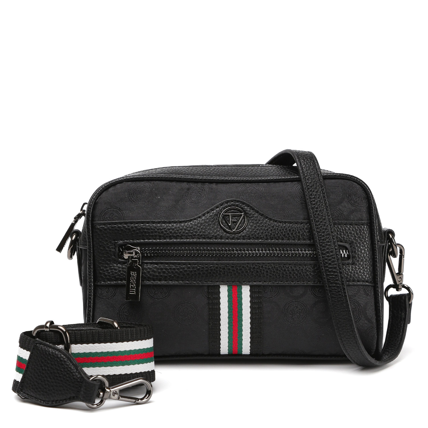 Компактная кросс-боди FABRETTI в черном цвете декорирована узором в стиле "Логомания". Двухслойный материал сумки - это текстильное волокно с фактурой жаккард, дублированное с высококачественным полиуретаном посредством термической обработки. Основное отделение закрывается на полукруглую молнию. Внутри есть карман на молнии для мелочей. На лицевой стороне расположен карман быстрого доступа на молнии. В комплекте 2 съемных плечевых ремня, регулируемых по длине: из экокожи и текстильный, шириной 1,5 см и 3,5 см соответственно. Цвет фурнитуры - черненый никель.