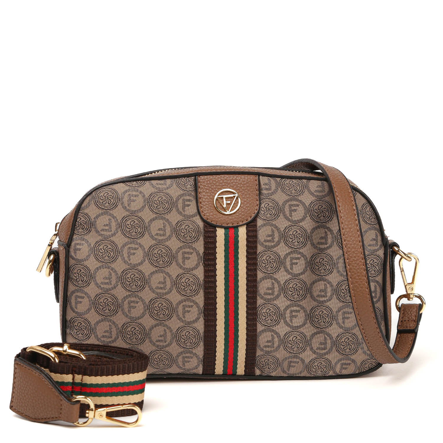 Компактная кросс-боди FABRETTI в коричневом оттенке декорирована узором в стиле "Логомания". Двухслойный материал сумки - это текстильное волокно с фактурой жаккард, дублированное с высококачественным полиуретаном посредством термической обработки. Основное отделение закрывается на полукруглую молнию. Внутри есть 2 кармана для мелочей: открытый и на молнии. Лицевая сторона украшена контрастной текстильной лентой. На тыльной стороне расположен карман быстрого доступа на молнии. В комплекте 2 съемных плечевых ремня, регулируемых по длине: из экокожи и текстильный, шириной 1,5 см и 3,5 см соответственно. Цвет фурнитуры - золото.