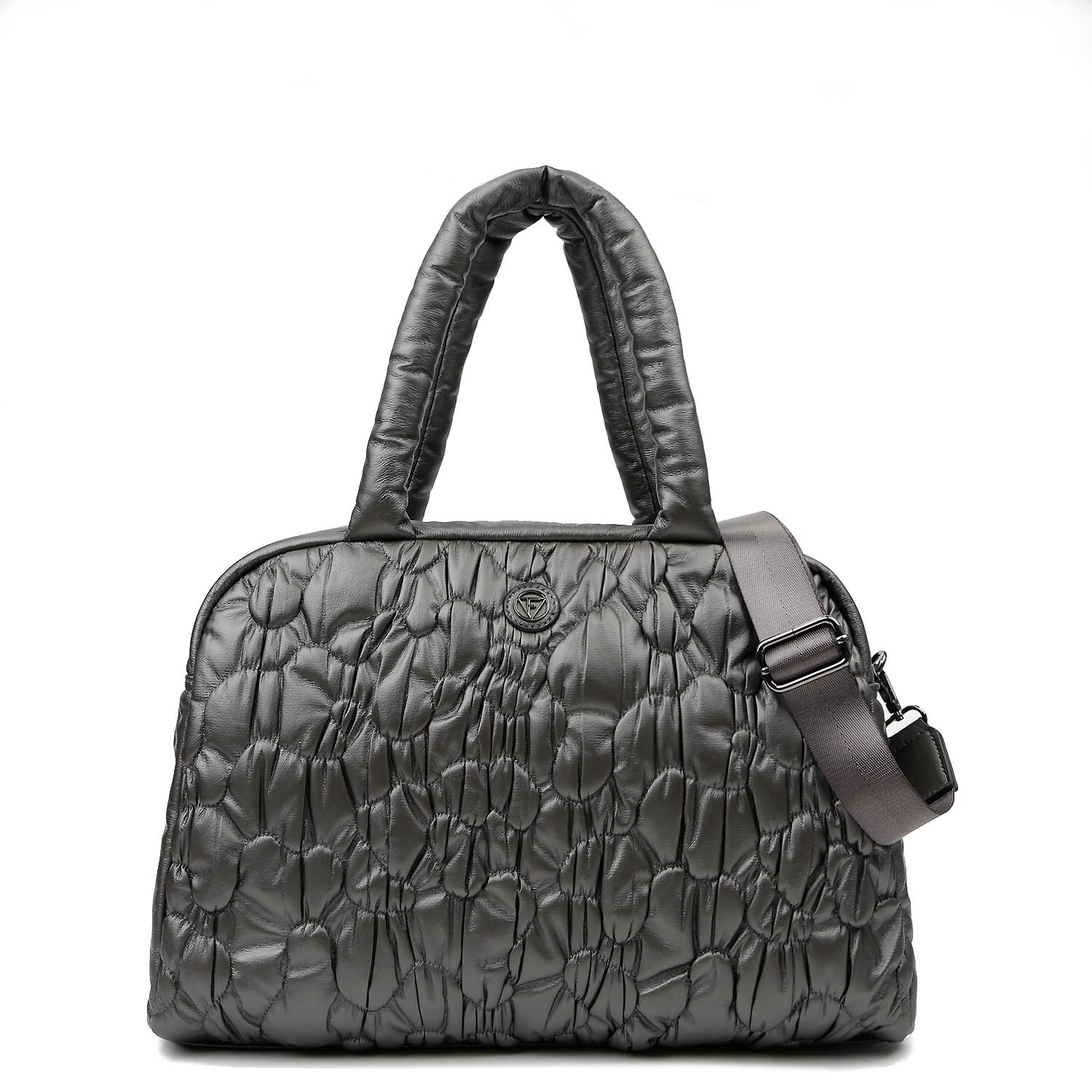 Женская стеганая дутая дорожная сумка среднего размера итальянского бренда FABRETTI выполнена из высокотехнологичного полиэстера, устойчивого к влаге и перепадам температур, в оттенке тёмно-серый металлик с отделкой из экокожи. Гладкая фактура дополнена абстрактной стежкой с элементами драпировки на лицевой стороне. Основное отделение закрывается на молнию. Внутри расположены два открытых кармана и карман на молнии. Модель оснащена двумя ручками длиной 50 см и съёмным регулируемым текстильным ремнём длиной 91–139 см и шириной 3,8 см. Цвет фурнитуры — серебро. Лаконичный дизайн с выразительной текстурой подойдёт как для дорожных образов, так и для активного ритма города.