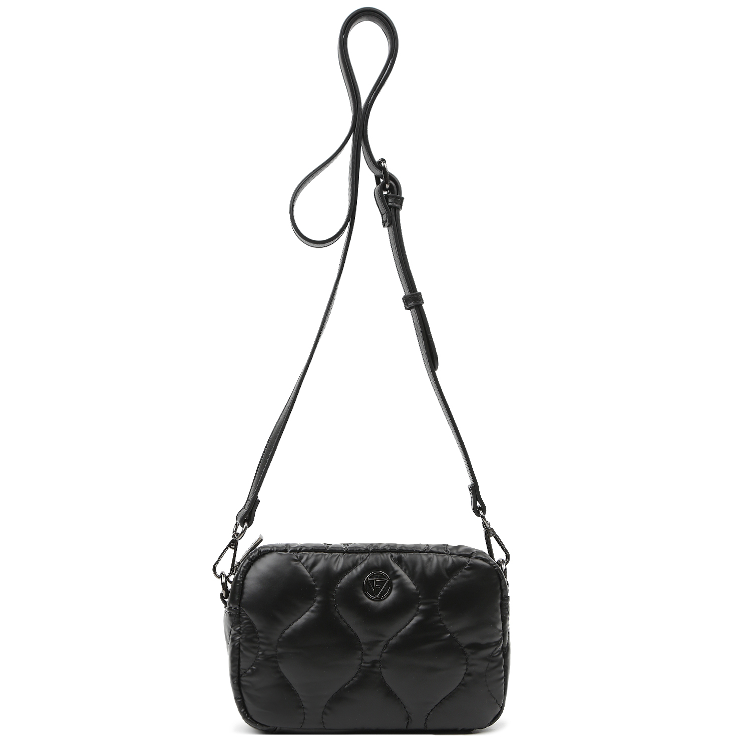 Стеганая сумка дутик кросс-боди итальянского бренда FABRETTI с геометрическим узором выполнена в классическом черном оттенке из высокотехнологичного полиэстера, устойчивого к влаге и перепадам температур. Основное отделение закрывается на молнию. Внутри — открытый карман и карман на молнии. Модель оснащена съёмным регулируемым ремешком длиной 119–135 см и шириной 1,5 см. Цвет фурнитуры — черный никель.