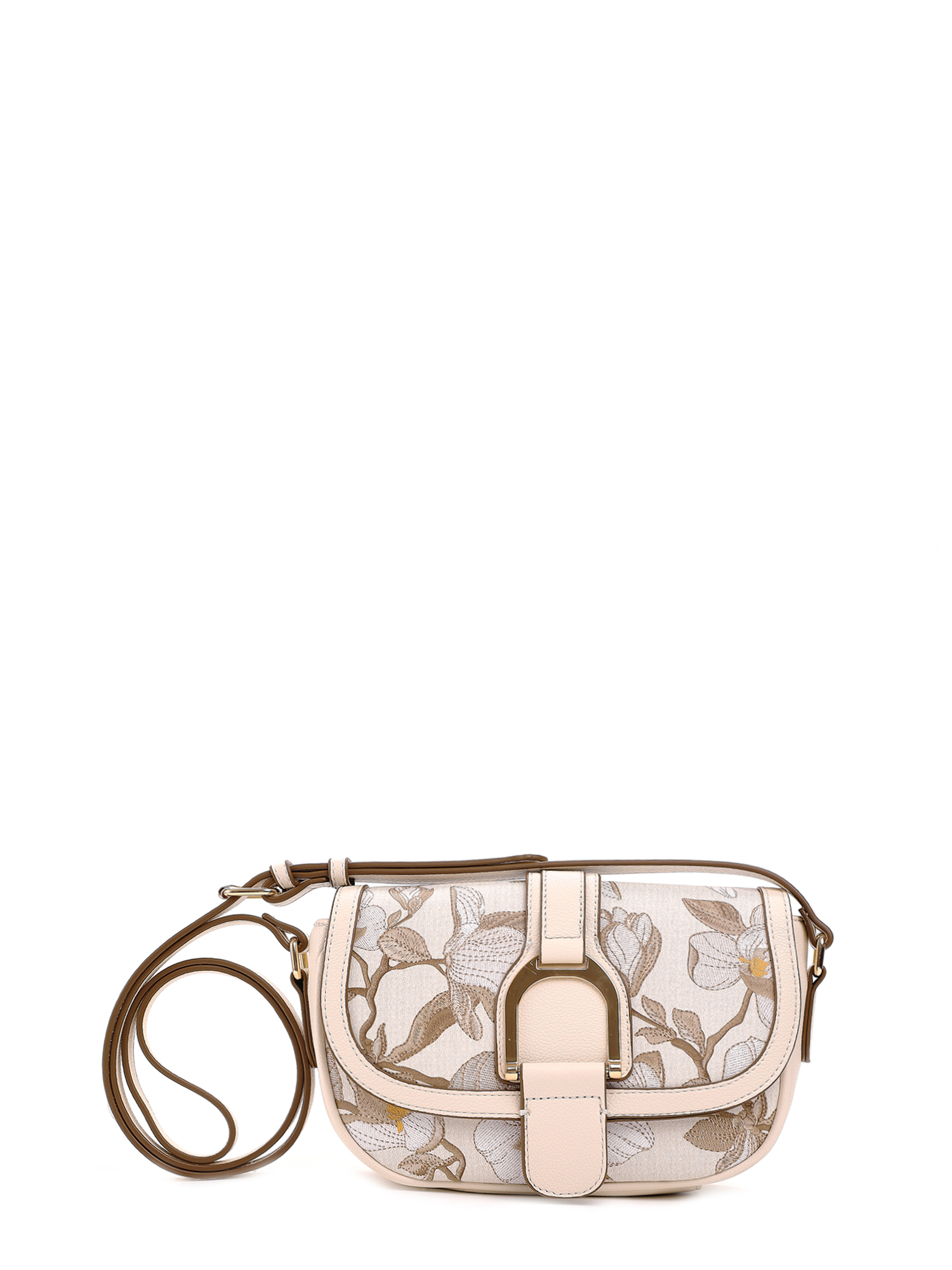 Небольшая женская сумка кросс-боди из коллекции итальянского бренда FABRETTI идеально подойдет для романтичного образа на теплый сезон. Округлая сумочка с клапаном на двух магнитах выполнена из мелкозернистой экокожи светло-бежевого оттенка и украшена роскошным рисунком цветущих магнолий. Края оформлены коричневым кантом; на клапане декоративный ремень с крупной металлической пряжкой.