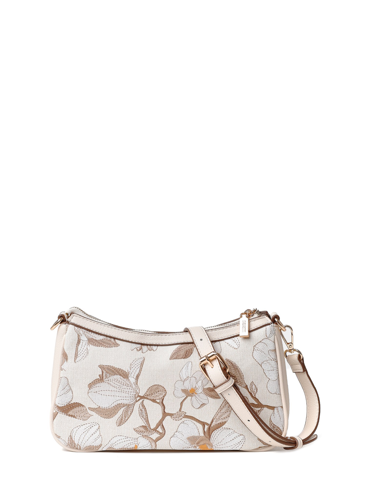 Миниатюрная женская сумка кросс-боди из коллекции итальянского бренда FABRETTI идеально подойдет для романтичного образа на теплый сезон. Прямоугольная сумочка с округлыми краями выполнена из мелкозернистой экокожи светлого бежевого оттенка и украшена роскошным рисунком цветущих магнолий. Бока и дно из однотонной бежевой экокожи. Кант по краям помогает каркасу держать форму.