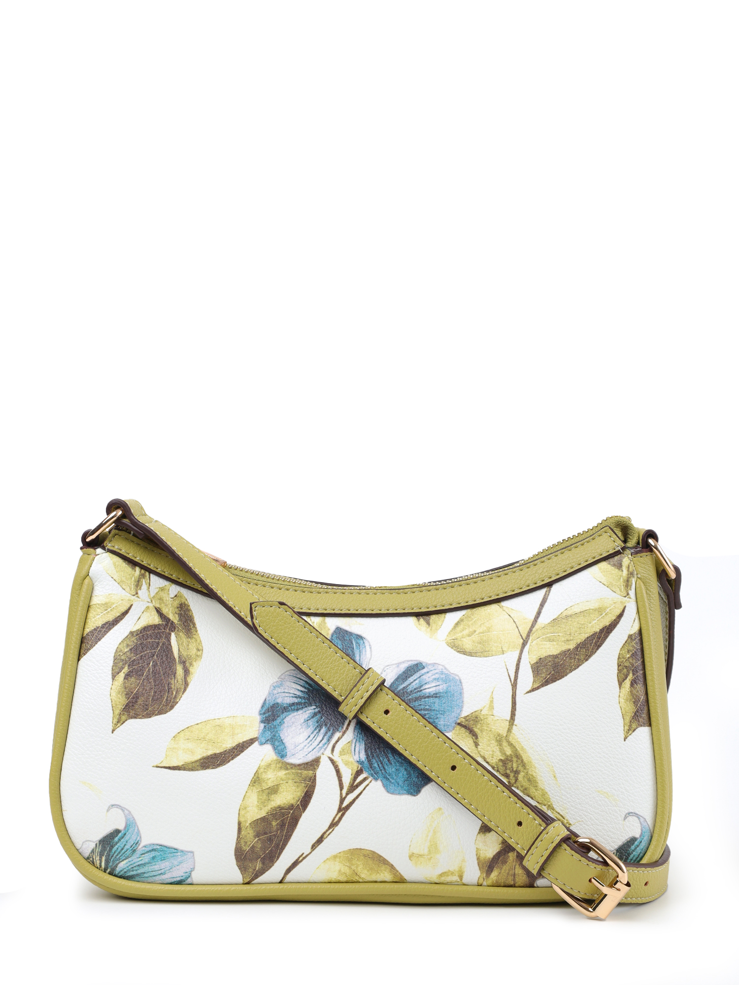 У сумки одно отделение на молнии, внутри открытый карман и на молнии. Модель украшена узором из пастельных голубых цветов и листьев. Плечевой ремень регулируется по длине пряжкой.