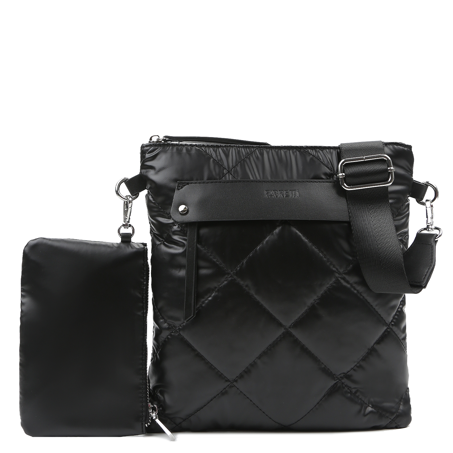 Стеганая сумка-планшет дутик итальянского бренда FABRETTI выполнена из высокотехнологичного полиэстера, устойчивого к влаге и перепадам температур, с вставками из экокожи, в черном оттенке. В комплекте прилагается небольшой кошелек на молнии размером 18×11 см. Основное отделение закрывается на молнию. Внутри предусмотрены небольшие карманы на молнии и открытый. На тыльной стороне расположен вместительный карман быстрого доступа на молнии, на лицевой — компактный карман на молнии. У сумки один съёмный регулируемый ремешок длиной 91–143 см и шириной 4 см. Цвет фурнитуры — серебро.