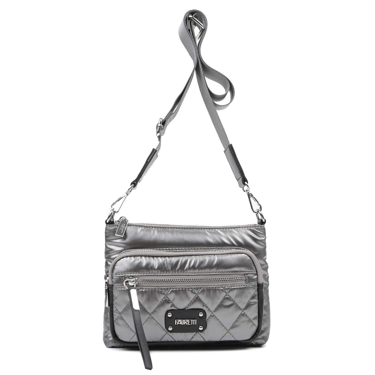 Стеганая сумка-дутик кросс-боди итальянского бренда FABRETTI выполнена из высокотехнологичного полиэстера, устойчивого к влаге и перепадам температур, в оттенке серый металлик. Основное отделение закрывается на молнию. Внутри — небольшой карман на молнии и один открытый. Спереди основного отделения расположено дополнительное отделение на молнии. На тыльной и лицевой стороне предусмотрены карманы быстрого доступа на молнии. У модели съёмный регулируемый текстильный ремешок длиной 90–140 см и шириной 4 см. Цвет фурнитуры — серебро. Функциональный выбор для повседневного комфорта.