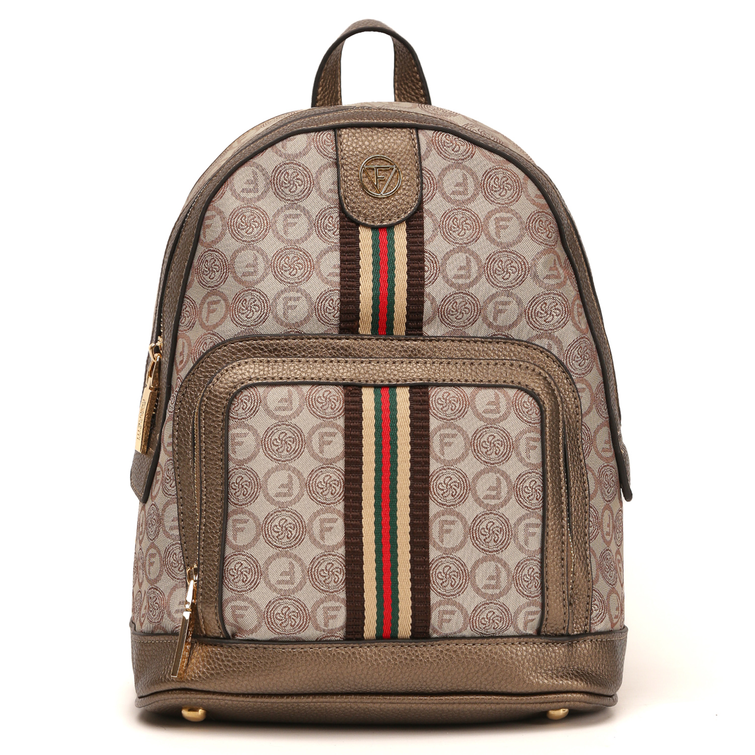 Стильный рюкзак FABRETTI в бежевом оттенке декорирован узором в стиле "Логомания". Двухслойный материал рюкзака - это текстильное волокно с фактурой жаккард, дублированное с высококачественным полиуретаном посредством термической обработки. Ручка, дно и другие элементы отделки выполнены из экокожи. Основное отделение закрывается на полукруглую молнию. Внутри 2 кармана для мелочей: открытый и на молнии. На лицевой стороне расположен накладной карман на полукруглой молнии. На тыльной стороне есть вертикальный карман быстрого доступа. Дно рюкзака защищают 4 металлические ножки. Лямки (ширина - 6,5 см) регулируются по длине. Цвет фурнитуры - золото.