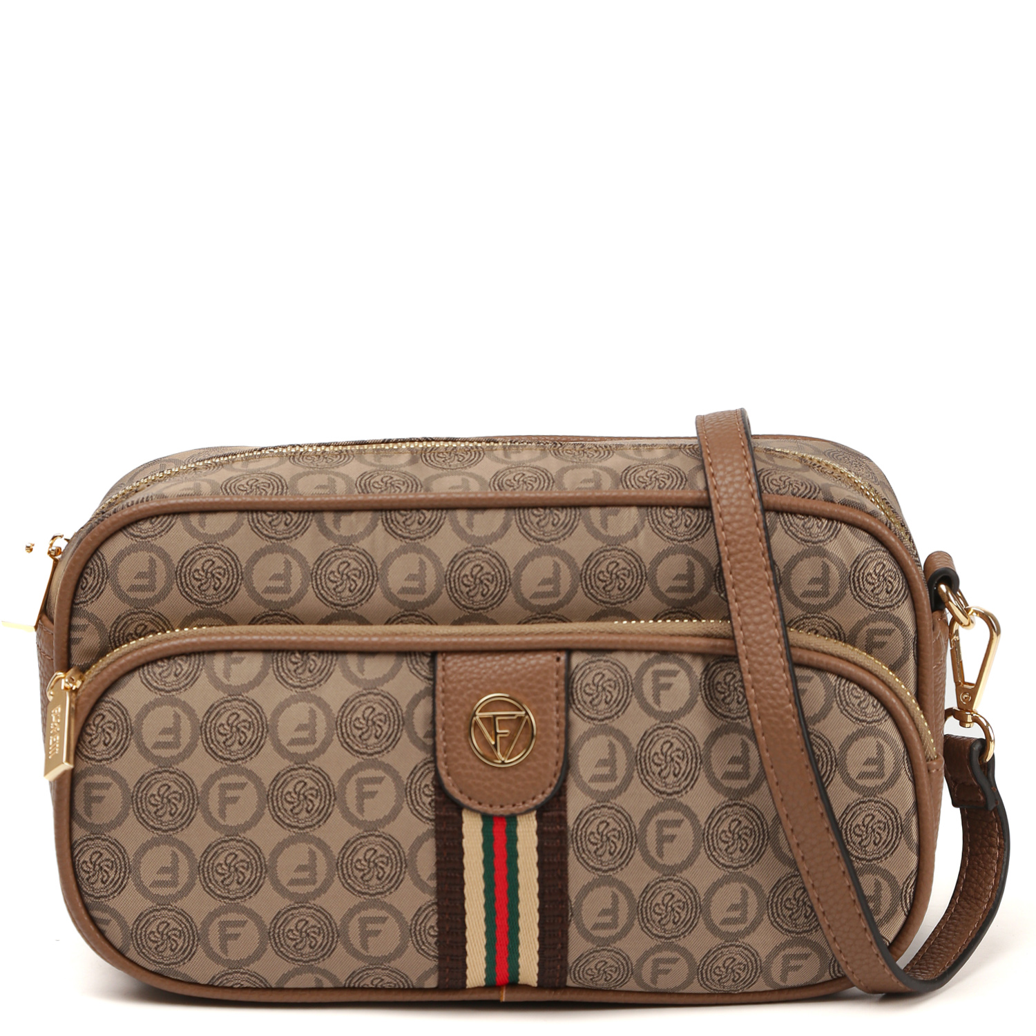 Компактная кросс-боди FABRETTI в коричневом оттенке декорирована узором в стиле "Логомания". Двухслойный материал сумки - это текстильное волокно с фактурой жаккард, дублированное с высококачественным полиуретаном посредством термической обработки. Основное отделение закрывается на полукруглую молнию. Внутри есть 2 кармана для мелочей: открытый и на молнии. На лицевой стороне расположен накладной карман на молнии. На тыльной стороне есть карман быстрого доступа на молнии. Съемный плечевой ремень регулируется по длине, ширина - 1,5 см. Цвет фурнитуры - золото.