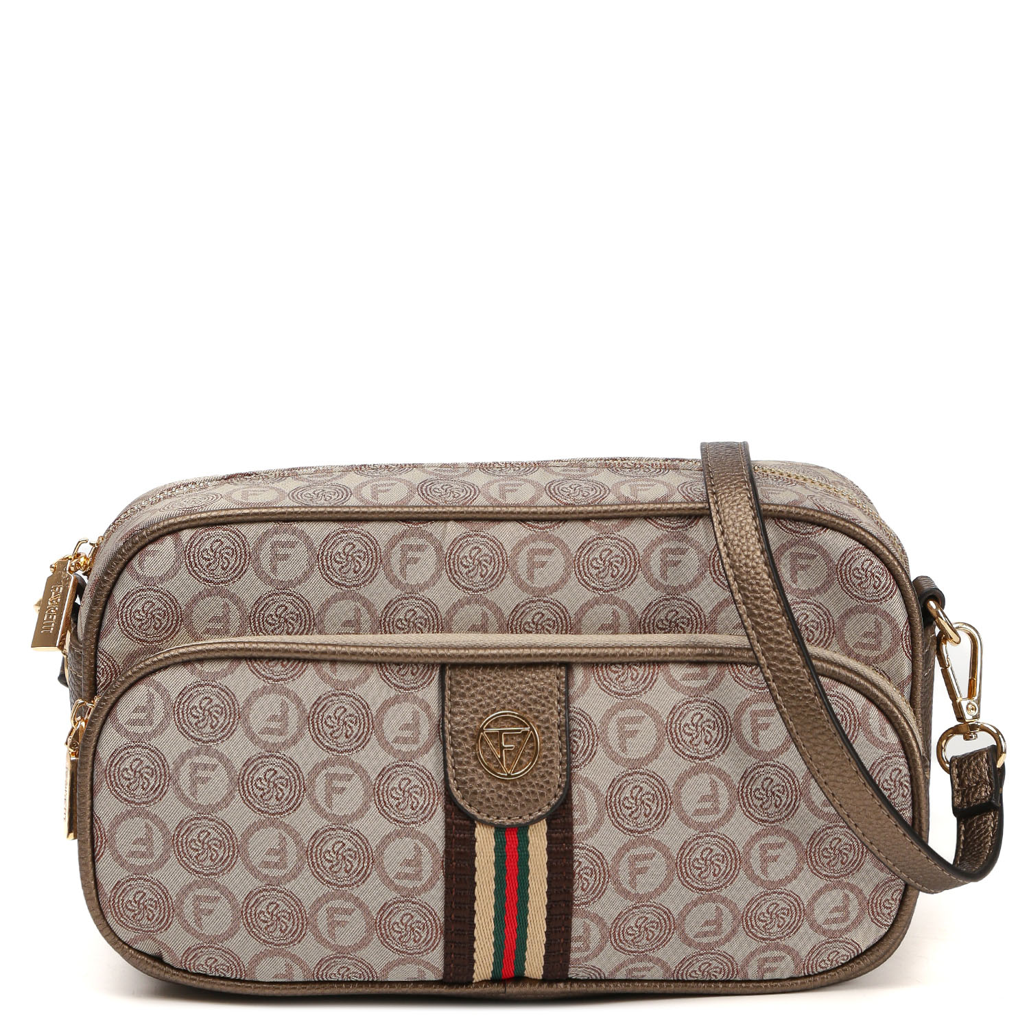 Компактная кросс-боди FABRETTI в бежевом оттенке декорирована узором в стиле "Логомания". Двухслойный материал сумки - это текстильное волокно с фактурой жаккард, дублированное с высококачественным полиуретаном посредством термической обработки. Основное отделение закрывается на полукруглую молнию. Внутри есть 2 кармана для мелочей: открытый и на молнии. На лицевой стороне расположен накладной карман на молнии. На тыльной стороне есть карман быстрого доступа на молнии. Съемный плечевой ремень регулируется по длине, ширина - 1,5 см. Цвет фурнитуры - золото.