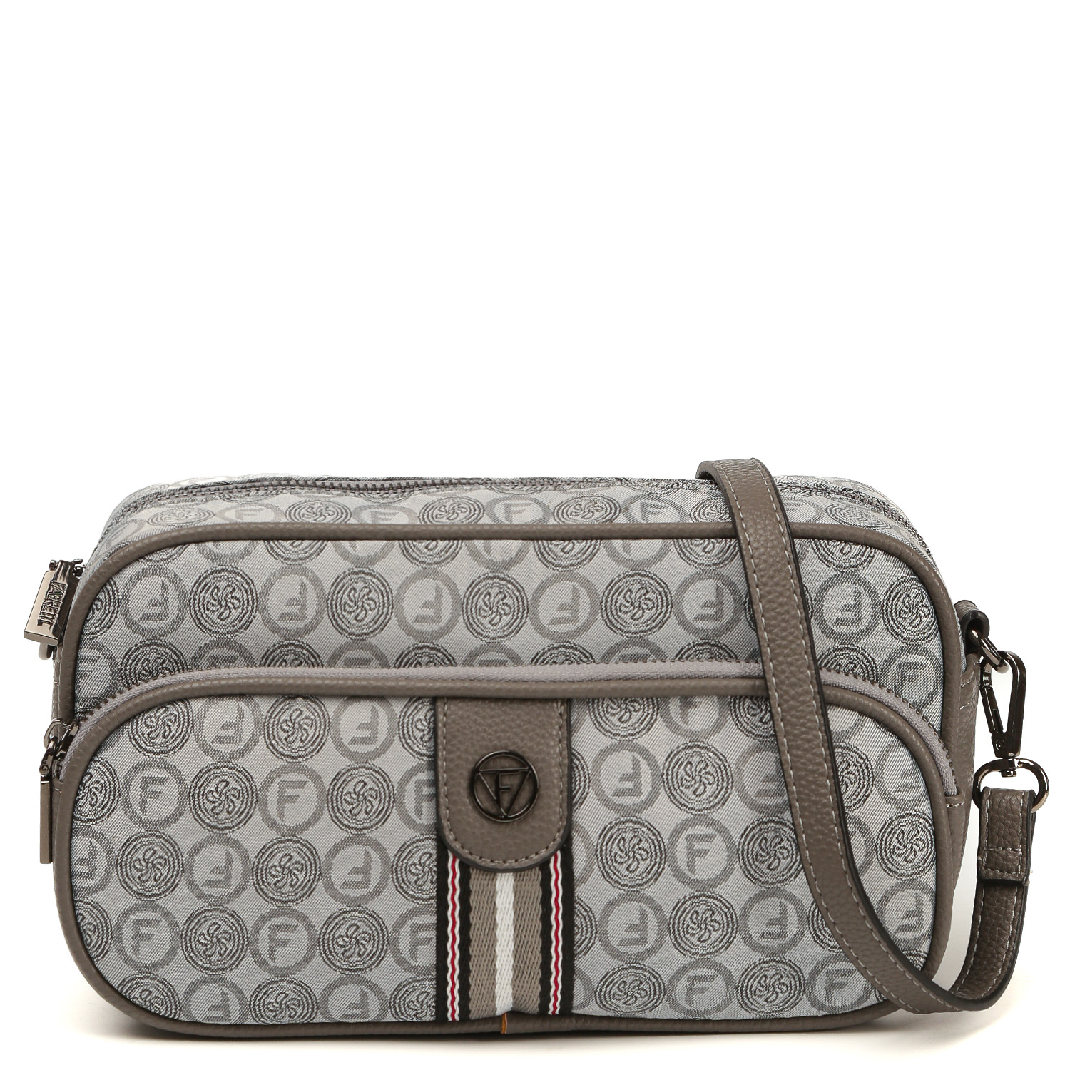 Компактная кросс-боди FABRETTI в сером оттенке декорирована узором в стиле "Логомания". Двухслойный материал сумки - это текстильное волокно с фактурой жаккард, дублированное с высококачественным полиуретаном посредством термической обработки. Основное отделение закрывается на полукруглую молнию. Внутри есть 2 кармана для мелочей: открытый и на молнии. На лицевой стороне расположен накладной карман на молнии. На тыльной стороне есть карман быстрого доступа на молнии. Съемный плечевой ремень регулируется по длине, ширина - 1,5 см. Цвет фурнитуры - черненый никель.