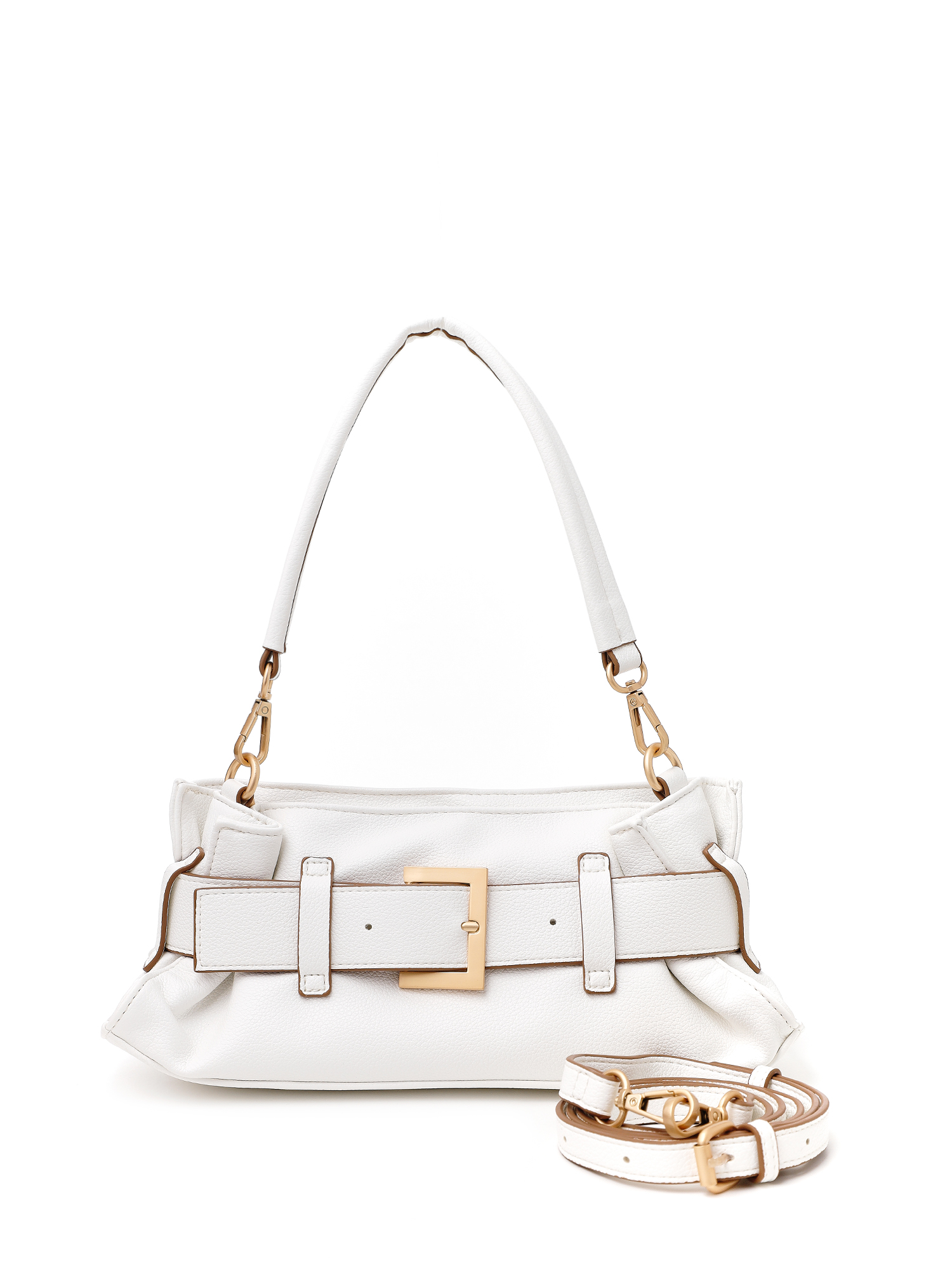 Миниатюрная женская сумка кросс-боди итальянского бренда FABRETTI из мягкой экокожи белого цвета с зернистой фактурой – акцентный аксессуар, который привлекает внимание своим необычным дизайном. Декоративный ремень, проходящий по центру, стягивает сумку, придавая ей сходство с сумкой-кисетом. Объем легко регулируется пряжкой цвета матовое золото.