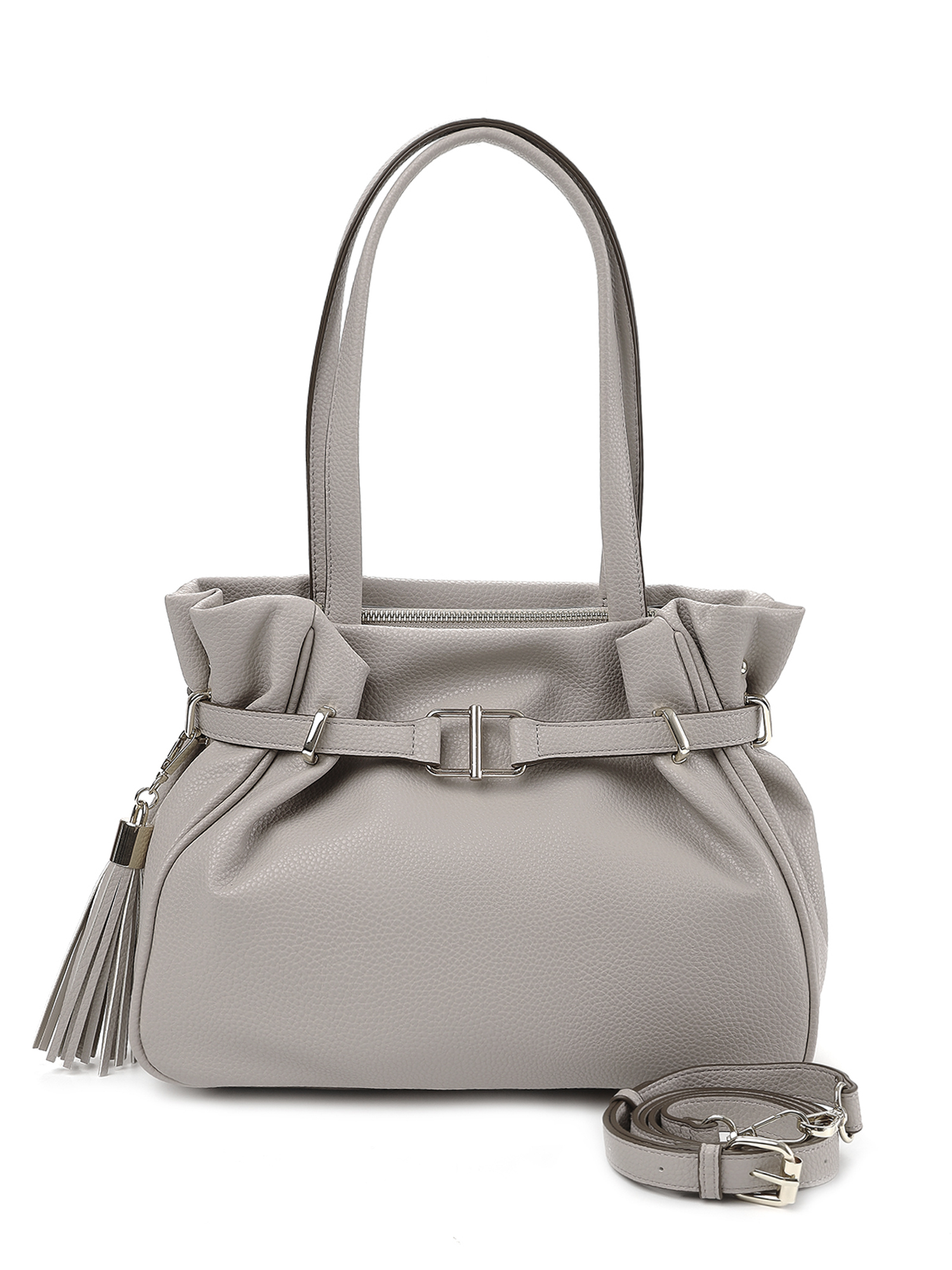 Необычная женская сумка сэтчел итальянского бренда FABRETTI из мягкой и нежной серо-бежевой экокожи с зернистой фактурой делает образ более динамичным и оригинальным благодаря своей нестандартной форме. Декоративный ремень, проходящий под горловиной сумки, создает классическую форму сумки-кисета, дополняет «старинный» дизайн брелок-кисточка на карабине.