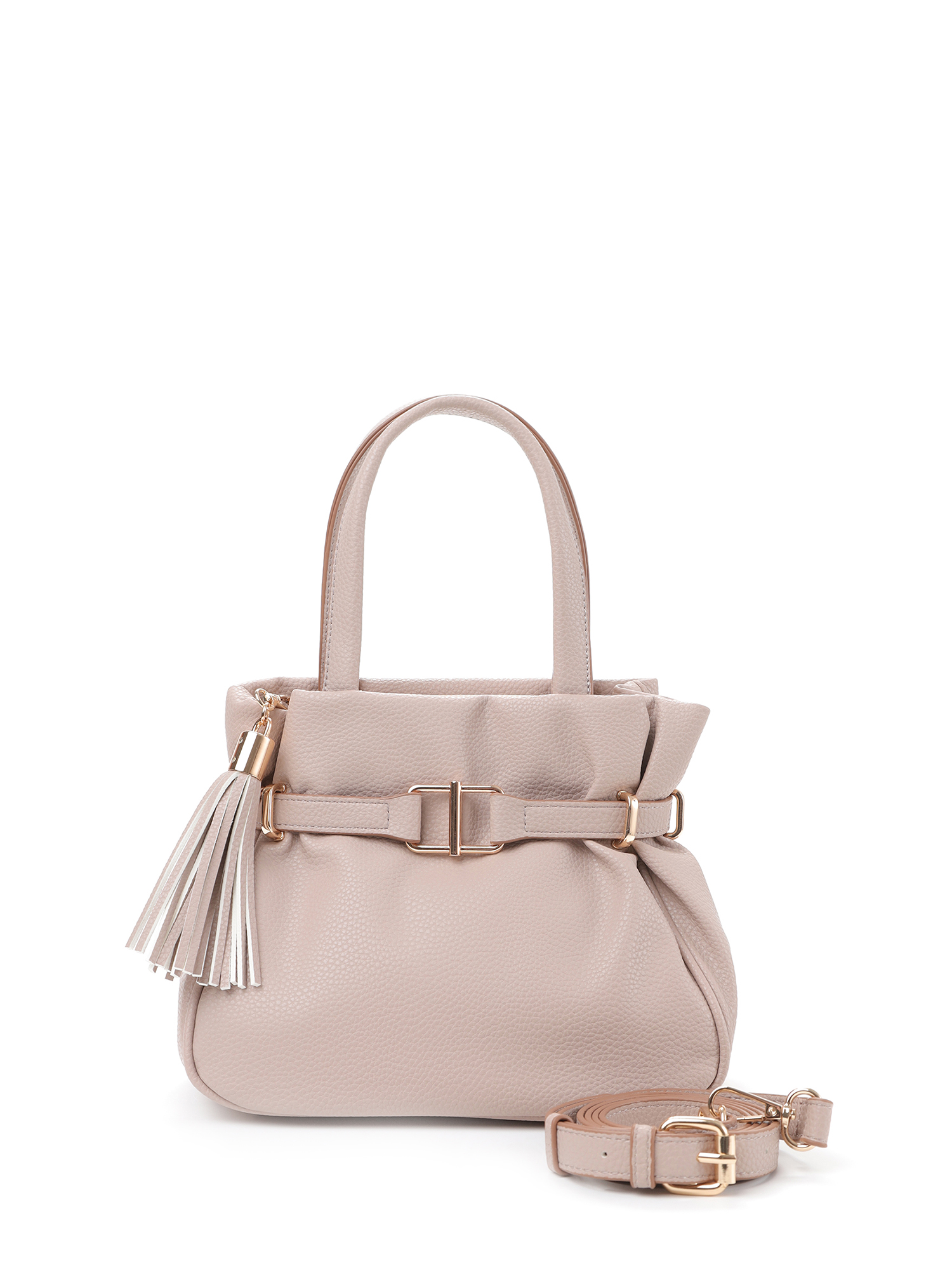 Небольшая женская сумка сэтчел итальянского бренда FABRETTI из мягкой и нежной светло-бежевой экокожи с зернистой фактурой делает образ более романтичным и оригинальным благодаря своей нестандартной форме. Декоративный ремень, проходящий под горловиной сумки, создает классическую форму сумки-кисета, дополняет «старинный» дизайн брелок-кисточка на карабине.