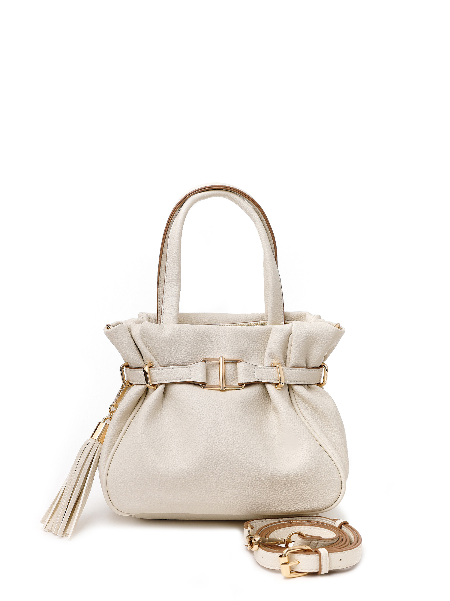 Небольшая женская сумка сэтчел итальянского бренда FABRETTI из мягкой и нежной белой экокожи с зернистой фактурой делает образ более романтичным и оригинальным благодаря своей нестандартной форме. Декоративный ремень, проходящий под горловиной сумки, создает классическую форму сумки-кисета, дополняет «старинный» дизайн брелок-кисточка на карабине.