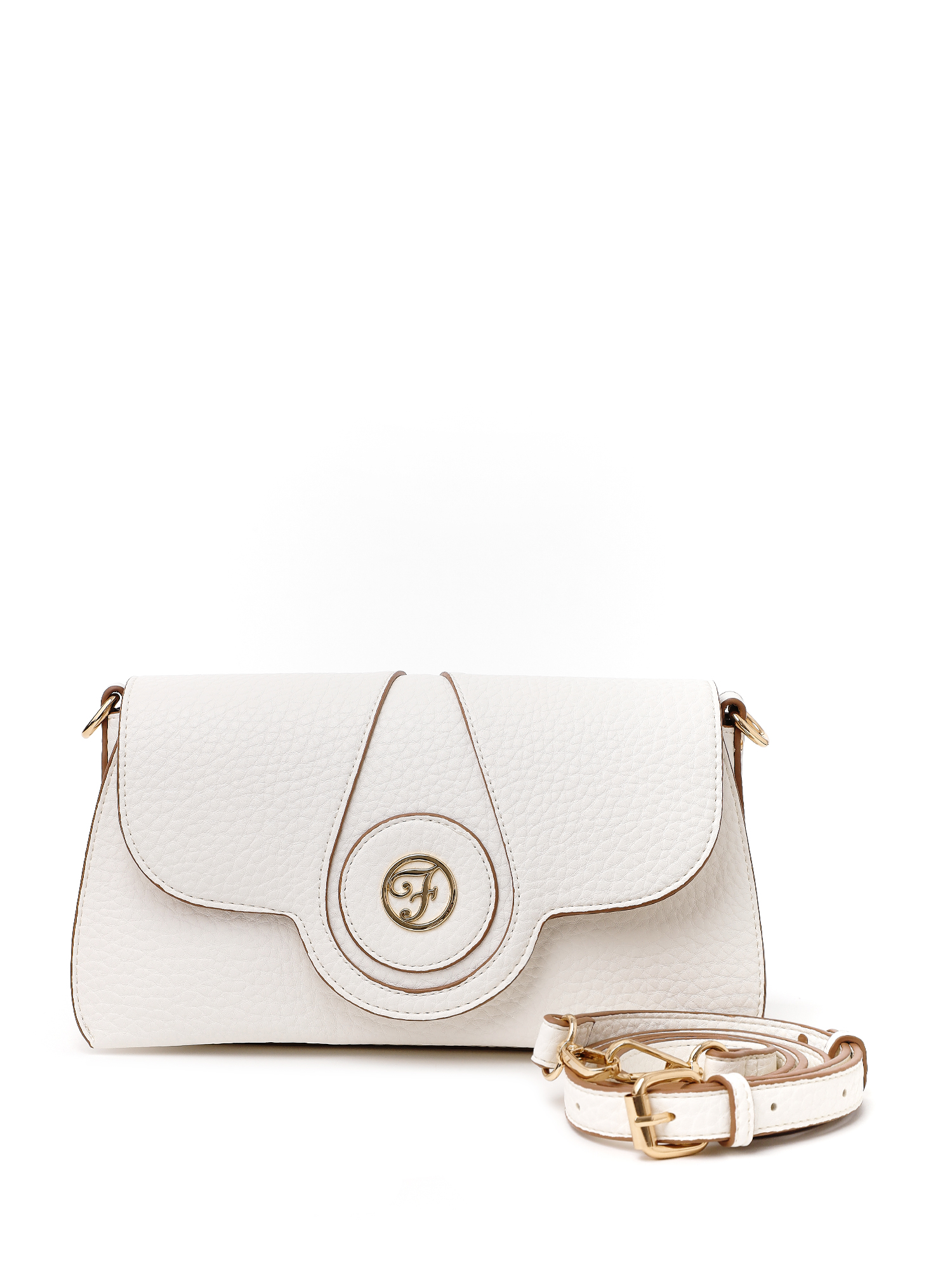 Небольшая женская сумочка кросс-боди итальянского бренда FABRETTI в романтичном дизайне с удобной внутренней организацией пространства. Крупнозернистая экокожа окрашена в чистый белый оттенок, срезы отделаны в тон светло-бежевым кантом. Клапан украшен украшен изящной металлической монограммой и каплевидным вырезом с отстрочкой – лаконично и элегантно.