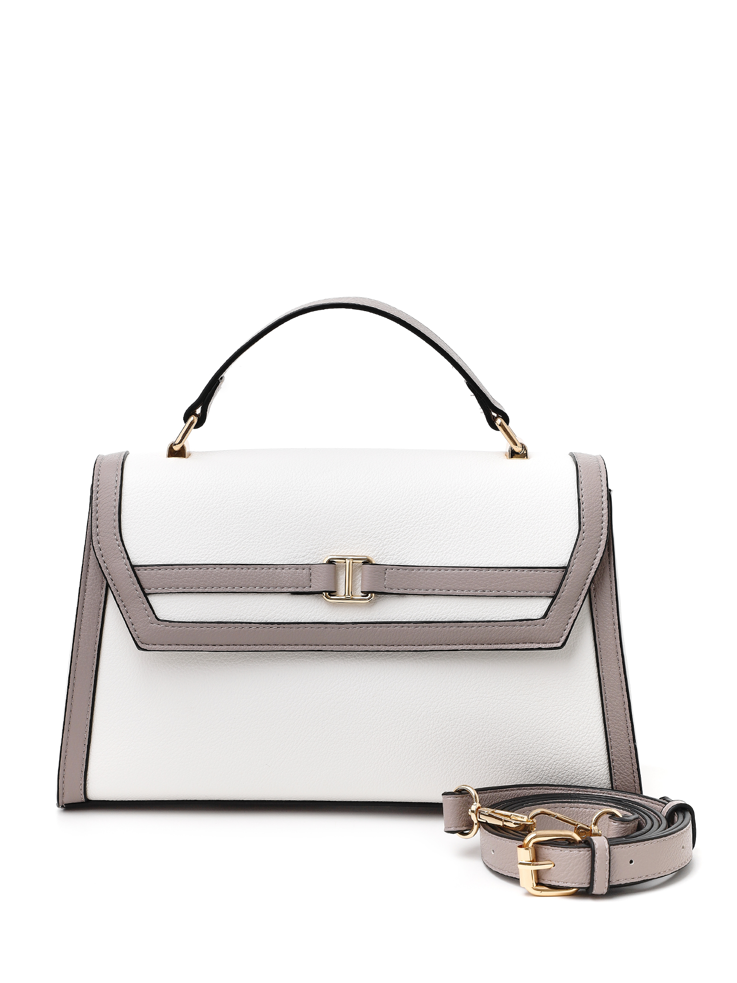 Строгая модель играет на контрастах – белая база сочетается с более темной отделкой. Чтобы подчеркнуть геометрию сумки, края срезов отделаны черным. Клапан дополнен небольшой золотой пряжкой, короткая ручка имеет фурнитуру из золотистого гальванического сплава.