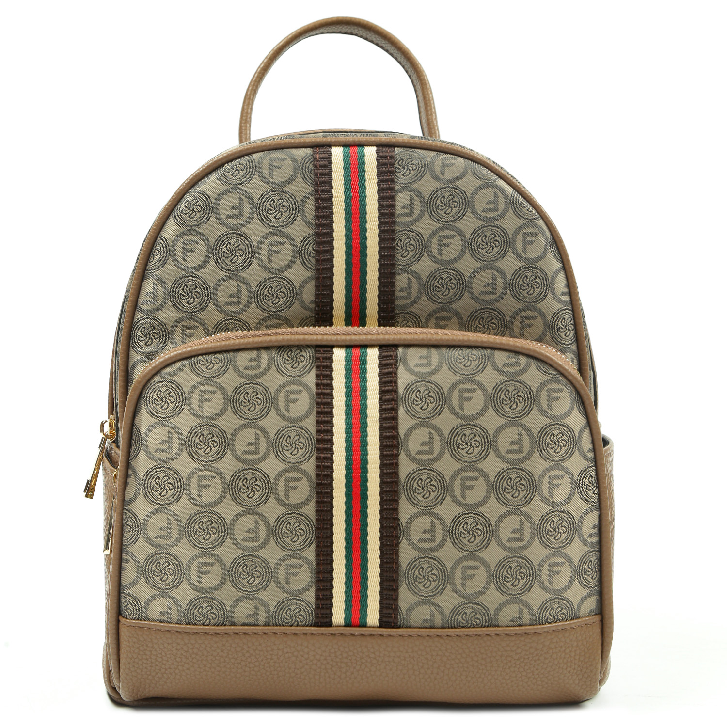 Стильный рюкзак FABRETTI в коричневом оттенке декорирован узором в стиле «Логомания». Рюкзак выполнен из высокотехнологичного полиэстера с текстурой жаккард, устойчивого к воздействию влаги и перепаду температур.  Основное отделение закрывается на молнию. Внутри 3 боковых кармана для мелочей: 2 открытых и на молнии. На лицевой стороне расположен вместительный накладной карман на полукруглой молнии. В качестве украшения выбрана контрастная текстильная лента. На тыльной стороне находится вертикальный карман быстрого доступа на молнии. По бокам есть открытые карманы. Ручка, лямки, дно и другие элементы отделки выполнены из экокожи. Лямки регулируются по длине, ширина - 2 см. Цвет фурнитуры - золото.