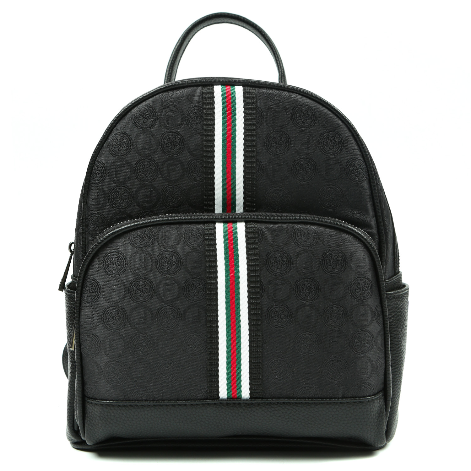 Стильный рюкзак FABRETTI в черном цвете декорирован узором в стиле «Логомания». Рюкзак выполнен из высокотехнологичного полиэстера с текстурой жаккард, устойчивого к воздействию влаги и перепаду температур.  Основное отделение закрывается на молнию. Внутри 3 боковых кармана для мелочей: 2 открытых и на молнии. На лицевой стороне расположен вместительный накладной карман на полукруглой молнии. В качестве украшения выбрана контрастная текстильная лента. На тыльной стороне находится вертикальный карман быстрого доступа на молнии. По бокам есть открытые карманы. Ручка, лямки, дно и другие элементы отделки выполнены из экокожи. Лямки регулируются по длине, ширина - 2 см. Цвет фурнитуры - черненый никель.