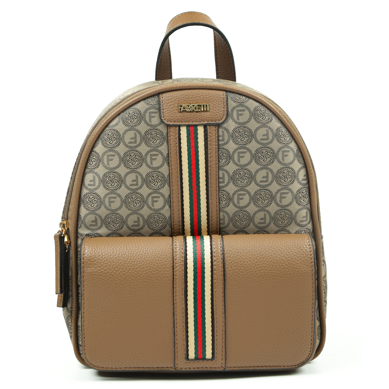 Стильный рюкзак FABRETTI в коричневом оттенке декорирован узором в стиле «Логомания». Рюкзак выполнен из высокотехнологичного полиэстера с текстурой жаккард, устойчивого к воздействию влаги и перепаду температур.  Основное отделение закрывается на молнию с 2 бегунками. Внутри 3 боковых кармана для мелочей: 2 открытых и на молнии. На лицевой стороне расположен вместительный накладной карман, закрывающийся клапаном на магнитной кнопке. В качестве украшения выбрана контрастная текстильная лента. На тыльной стороне расположен вертикальный карман быстрого доступа на молнии. Ручка, лямки и другие элементы отделки выполнены из экокожи. Лямки регулируются по длине, ширина - 1,5 см. Цвет фурнитуры - золото.