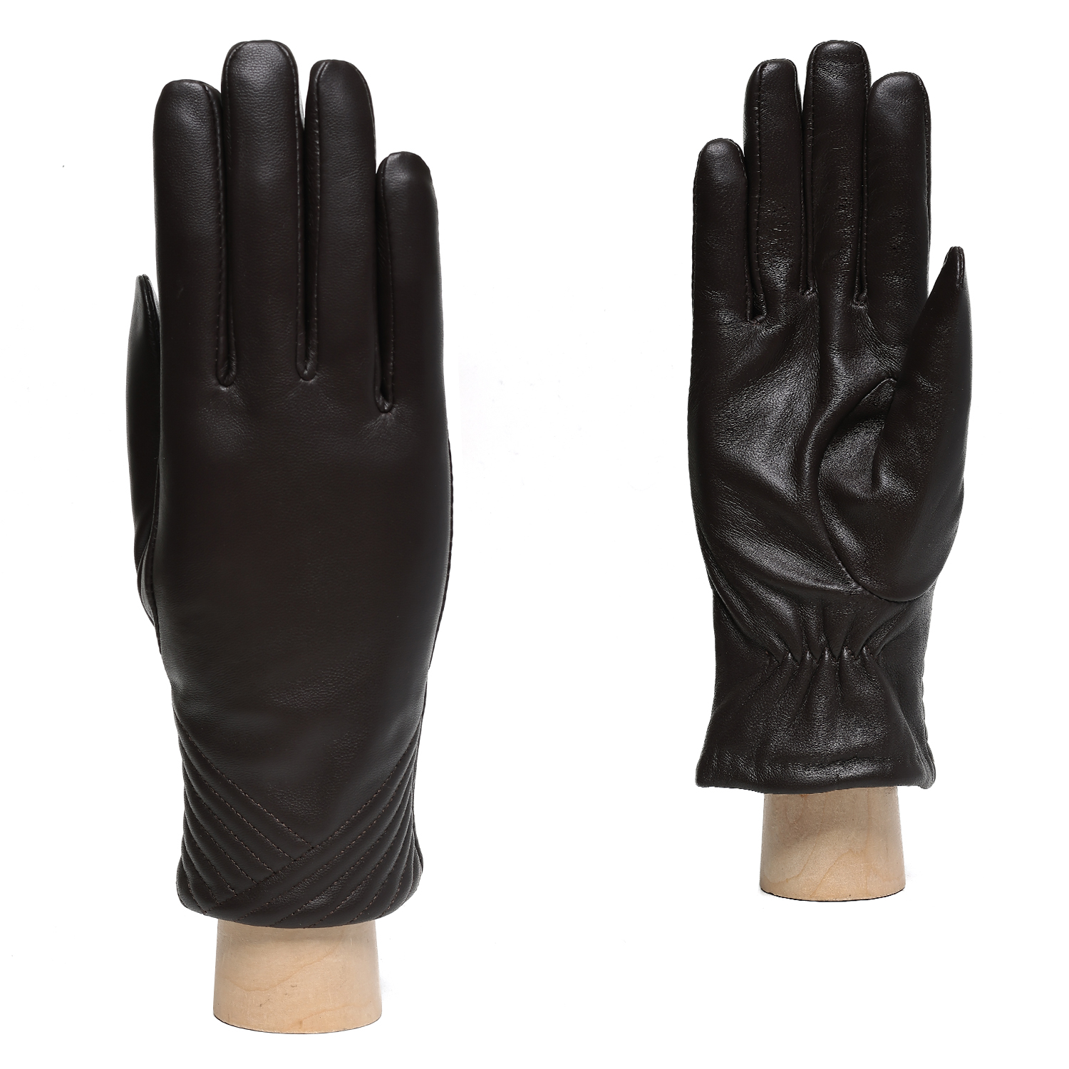 Лицевая сторона украшена узором из диагональных отстрочек. Для комфортной посадки перчатки дополнены резинкой внутри манжеты с тыльной стороны.