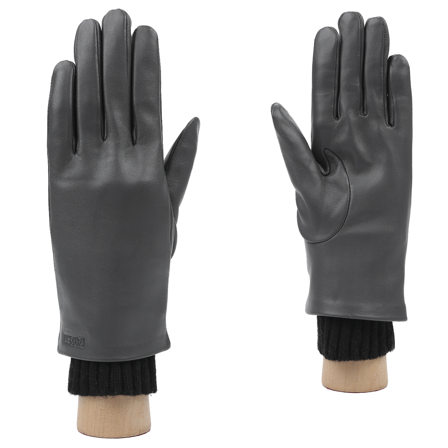 Оригинальные женские перчатки итальянского бренда FABRETTI из натуральной кожи ягненка в темно-сером цвете. Модель дополнена подкладкой из теплой натуральной шерсти и необычно украшена удлиненными вязаными манжетами в рубчик черного цвета.