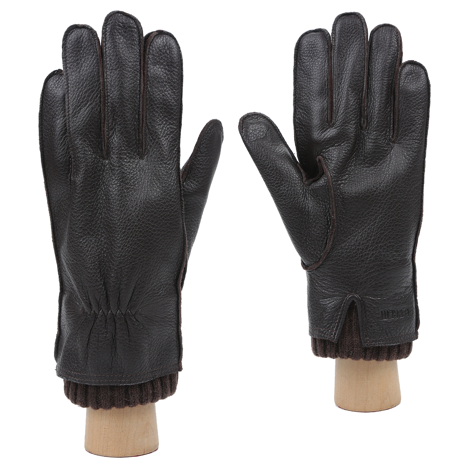 Теплые мужские перчатки итальянского бренда FABRETTI выполнены из премиальной кожи оленя с узнаваемым шагреневым рисунком в коричневом цвете. Модель дополнена подкладкой из теплой натуральной шерсти и необычно украшена удлиненными вязаными манжетами в рубчик в тон кожи.