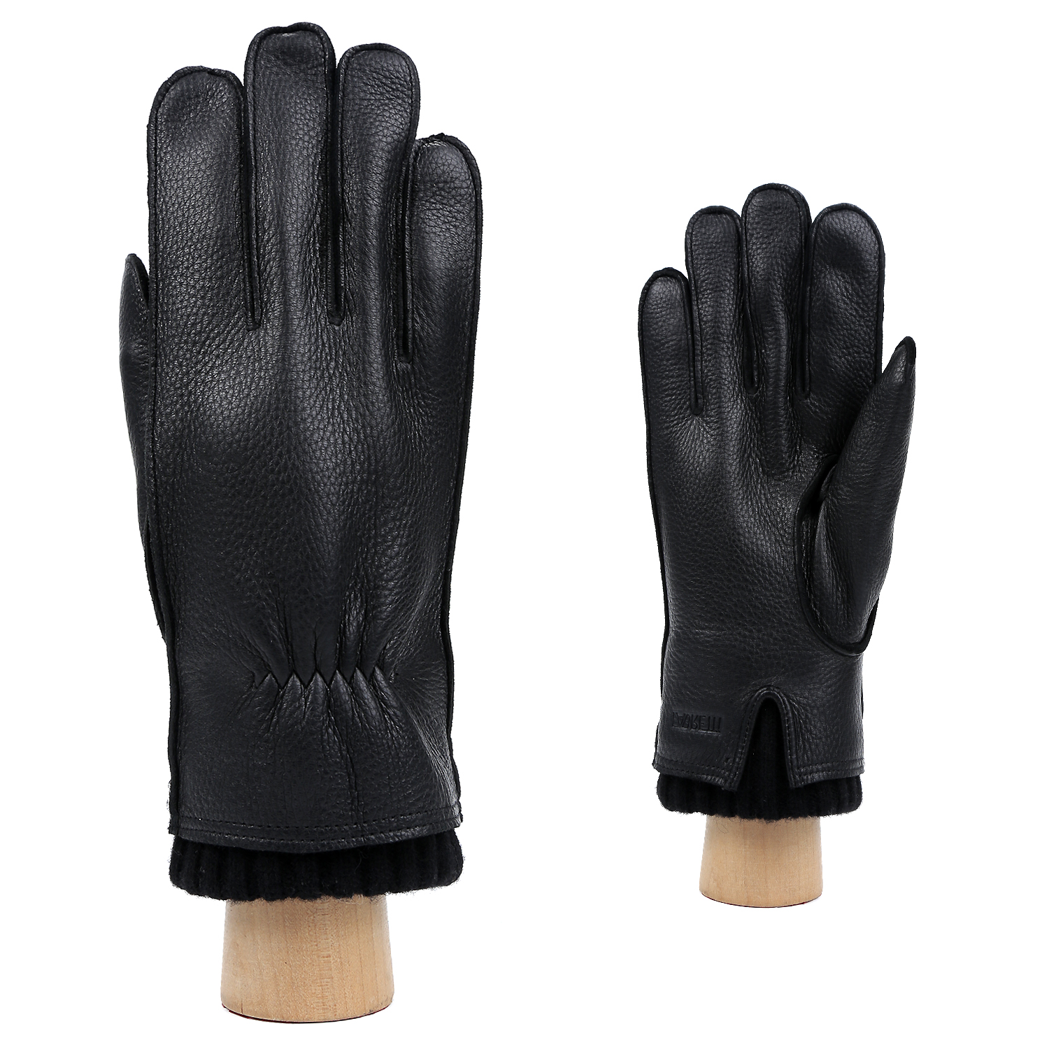 Теплые мужские перчатки итальянского бренда FABRETTI выполнены из премиальной кожи оленя с узнаваемым шагреневым рисунком в черном цвете. Модель дополнена подкладкой из теплой натуральной шерсти и необычно украшена удлиненными вязаными манжетами в рубчик в тон кожи.