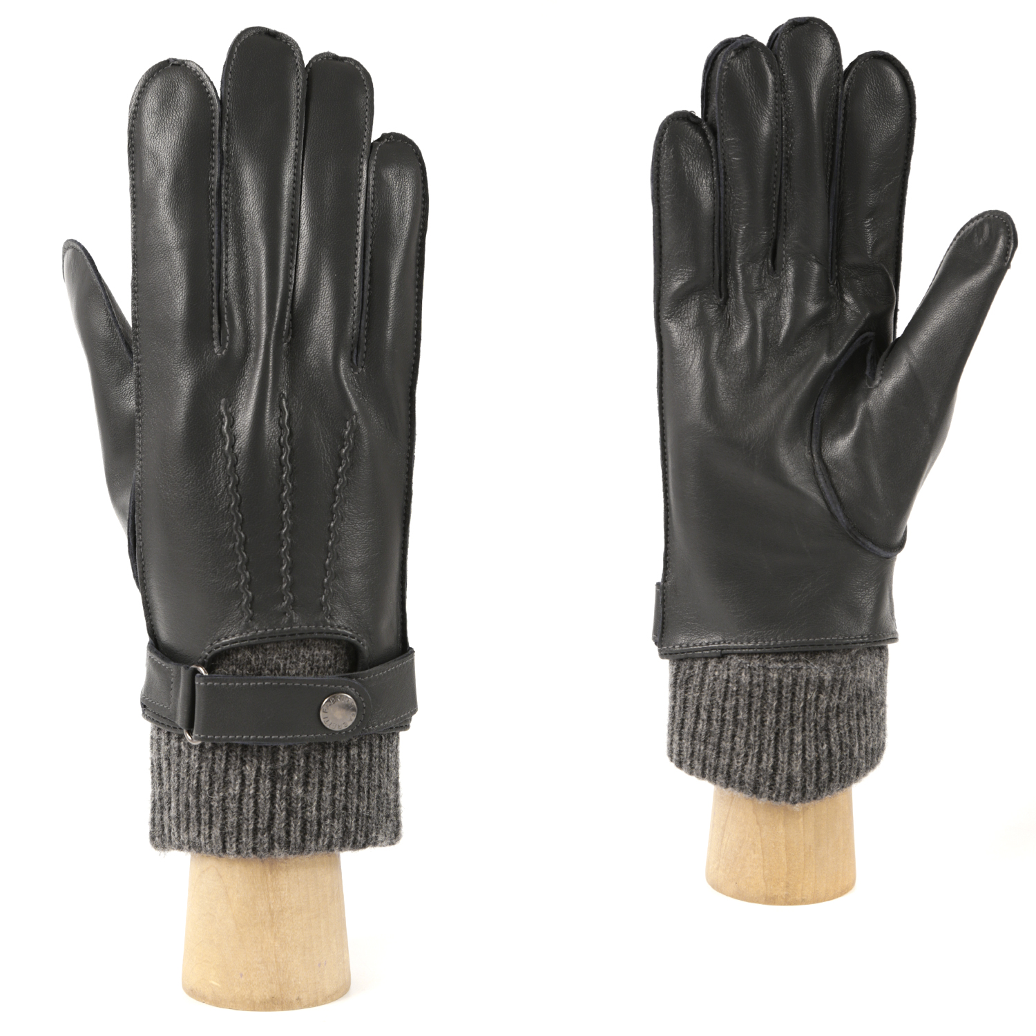 Теплые мужские перчатки итальянского бренда FABRETTI выполнены из натуральной кожи ягненка в темно-сером цвете и отличаются гладкой фактурой. Модель дополнена подкладкой из теплой натуральной шерсти и необычно украшена удлиненными вязаными манжетами в рубчик серого цвета.