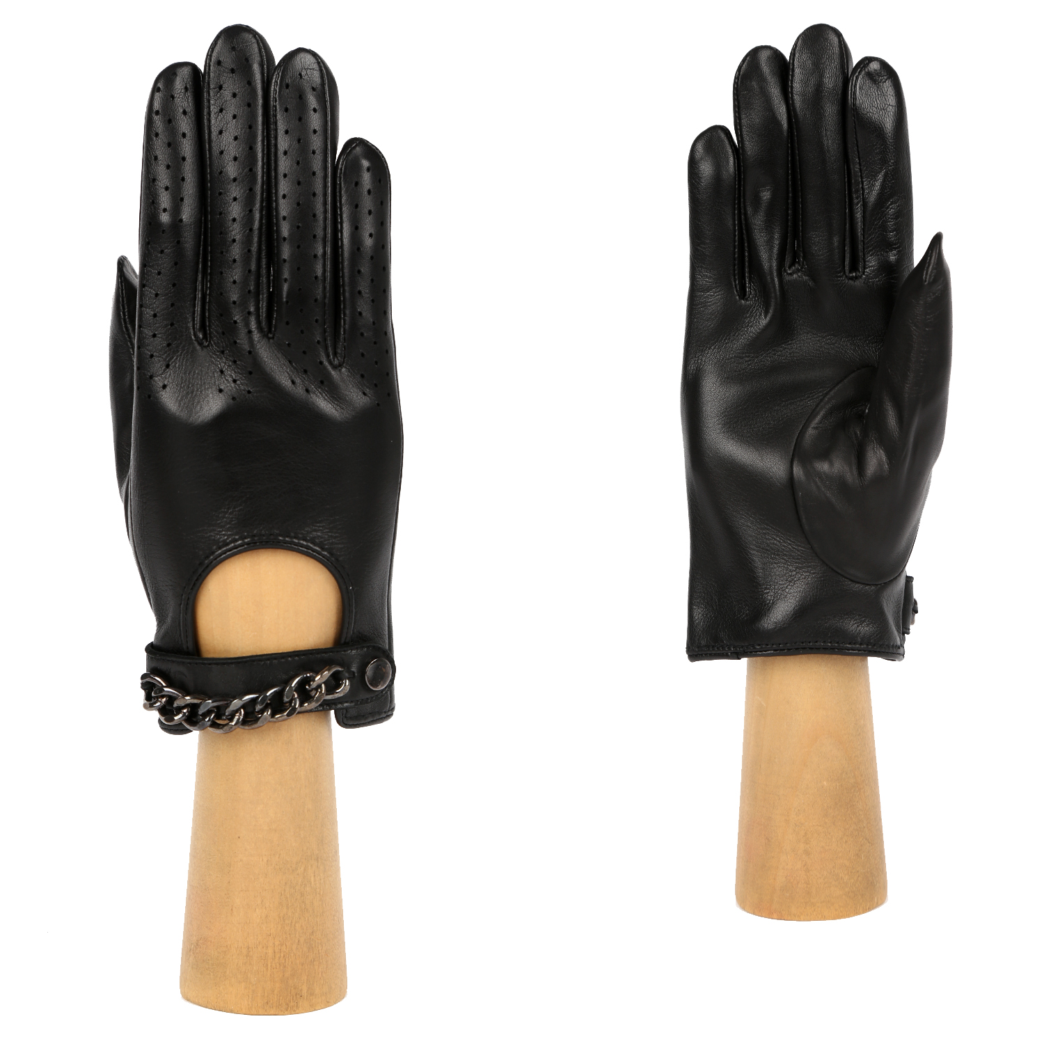 Женские перчатки FABRETTI в черном цвете выполнены из натуральной кожи ягненка мягкой нежной фактуры. Лицевая сторона декорирована эффектной цепочкой и перфорацией. Изящный кожаный ремешок на кнопке позволяет комфортно надевать и снимать аксессуар. Шелковая подкладка подарит рукам приятный комфорт в прохладный сезон.