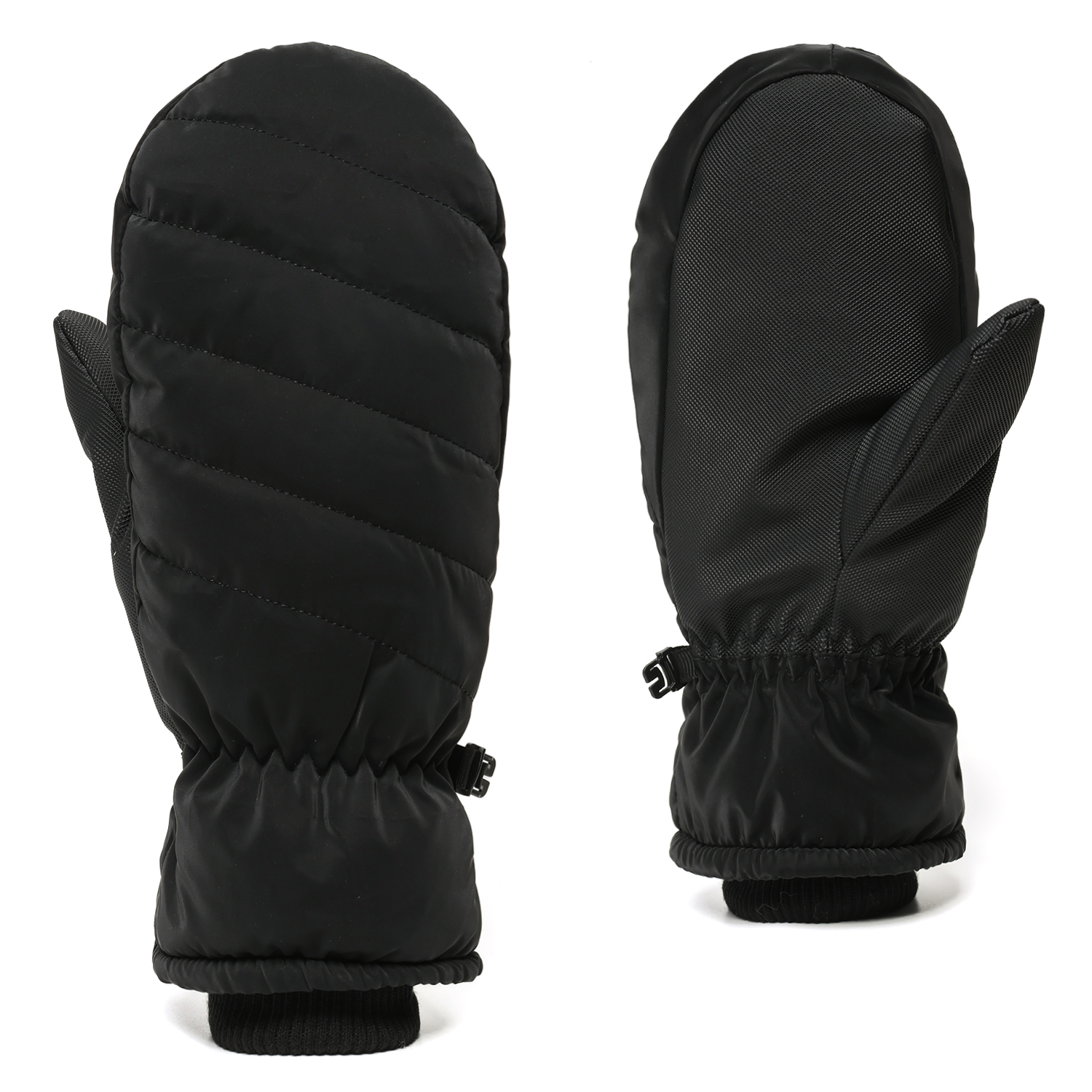 Верх черного цвета выполнен из синтетической ткани с ветро- и влагозащитными свойствами и дополнительно простеган для равномерного распределения утеплителя. Тыльная сторона выполнена из текстурированного прорезиненного материала, не пропускающего влагу. У материала также есть антискользящий эффект, например, для более комфортного использования лыжных палок.
