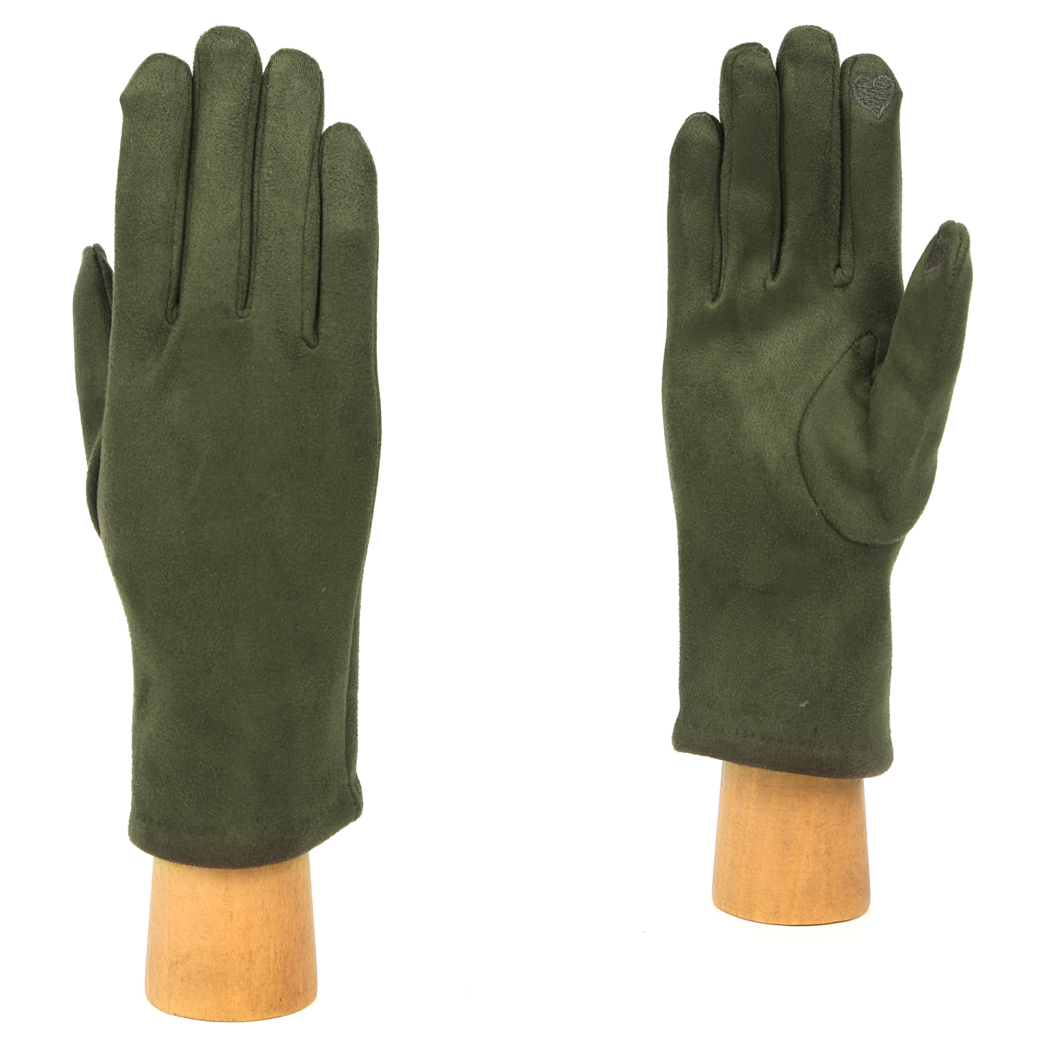 Стильные перчатки FABRETTI выполнены из искусственной замши в зеленом оттенке. Обладают мягкой фактурой, хорошо сидят на руке, отлично сохраняют тепло.   Перчатки снабжены функцией Touch Screen, что позволит пользоваться сенсорными устройствами, не снимая аксессуар. Будут гармонично смотреться с куртками, пуховиками и пальто. Прекрасный вариант для межсезонья и европейской зимы.