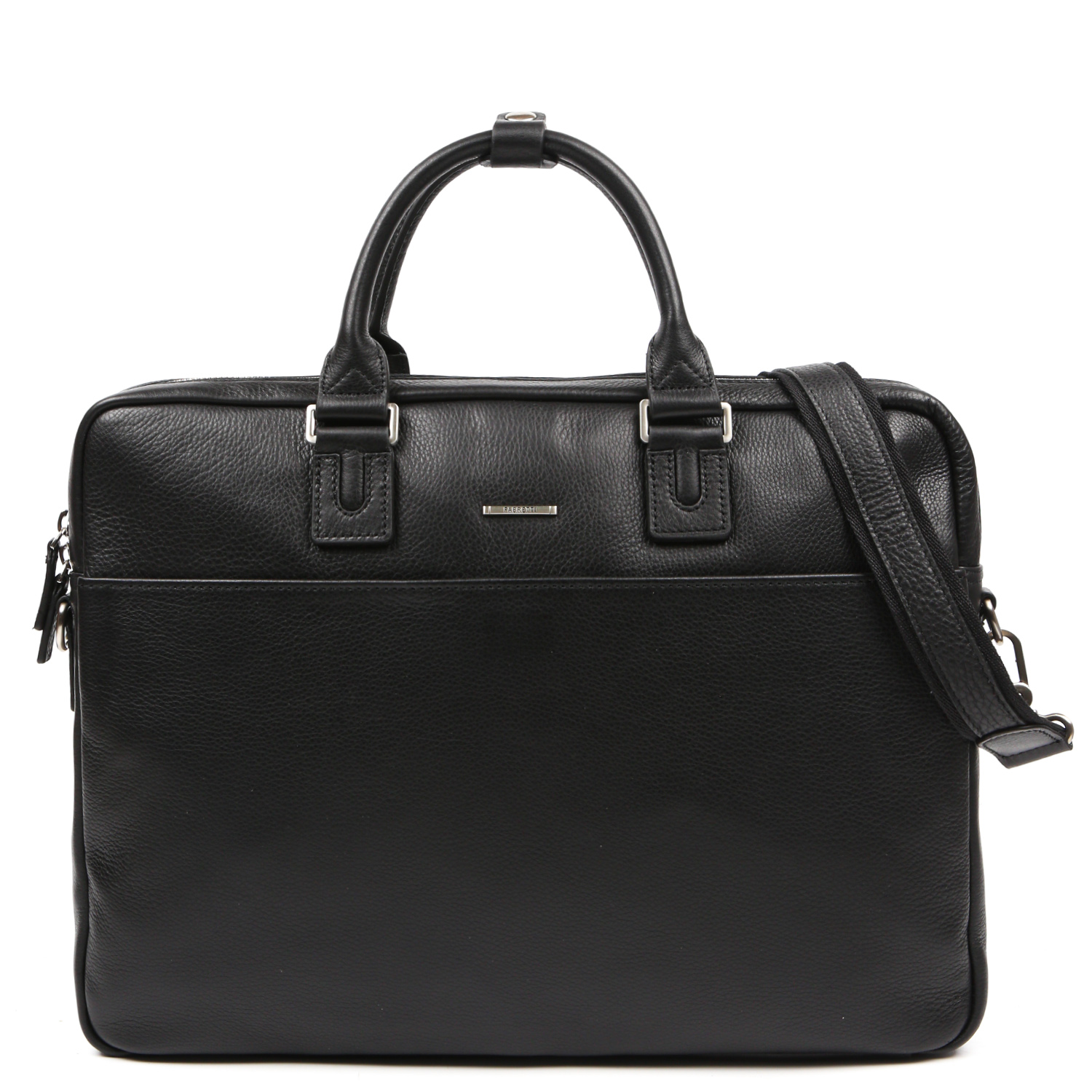 Стильная мужская сумка для документов FABRETTI выполнена из натуральной зернистой кожи в черном цвете. Модель имеет две ручки и съемный плечевой ремень, длина которого регулируется, ширина - 3 см.