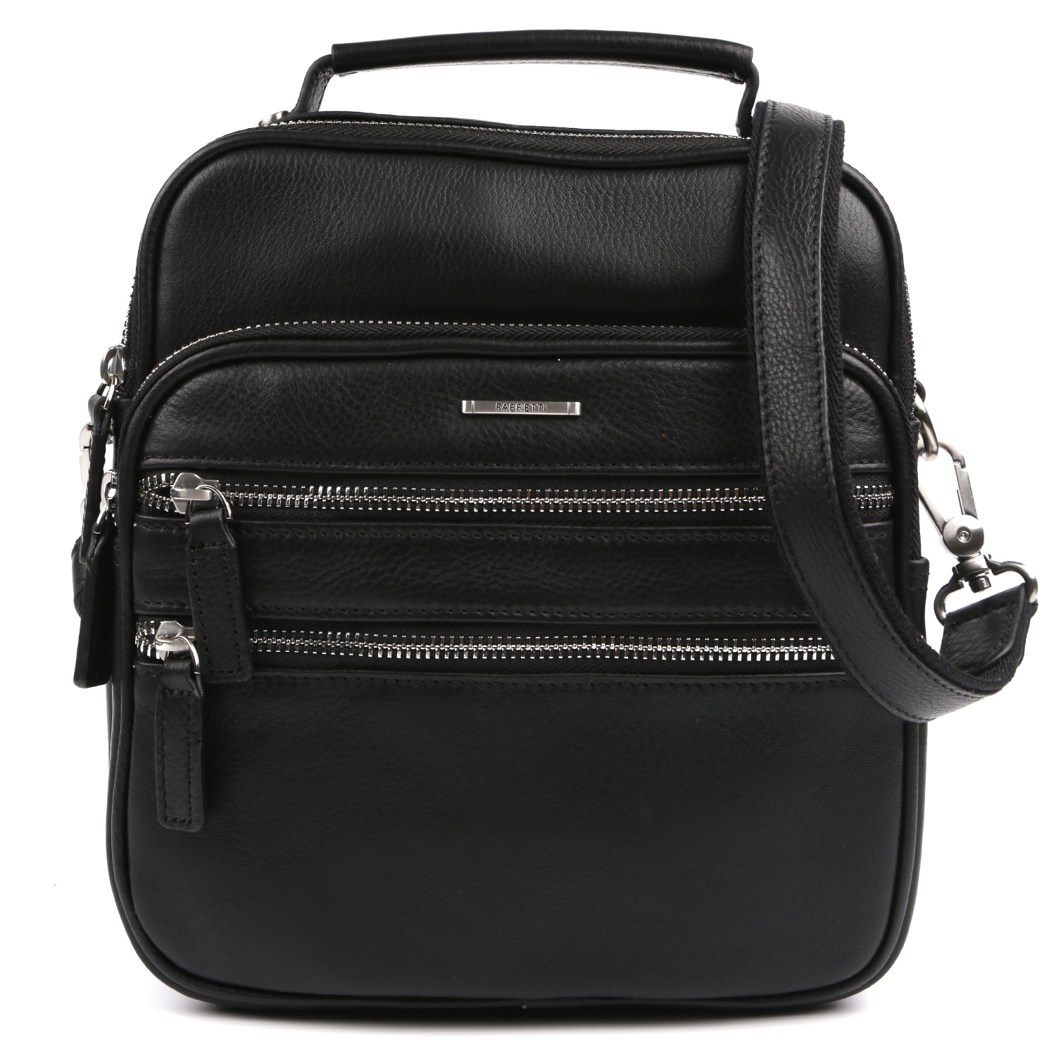 Вместительная мужская сумка на плечо FABRETTI выполнена из натуральной зернистой кожи черного цвета. Сумка имеет 2 отделения, каждое из которых закрывается на полукруглую молнию. Внутри одного есть открытый боковой карман для мелочей, в другом есть боковой карман на молнии. На лицевой стороне находятся 3 вместительных кармана на молнии, на тыльной стороне - карман быстрого доступа на молнии. Для большего удобства на сумке предусмотрена ручка. Съемный плечевой ремень регулируется по длине, ширина - 2,5 см. Цвет фурнитуры - серебро.