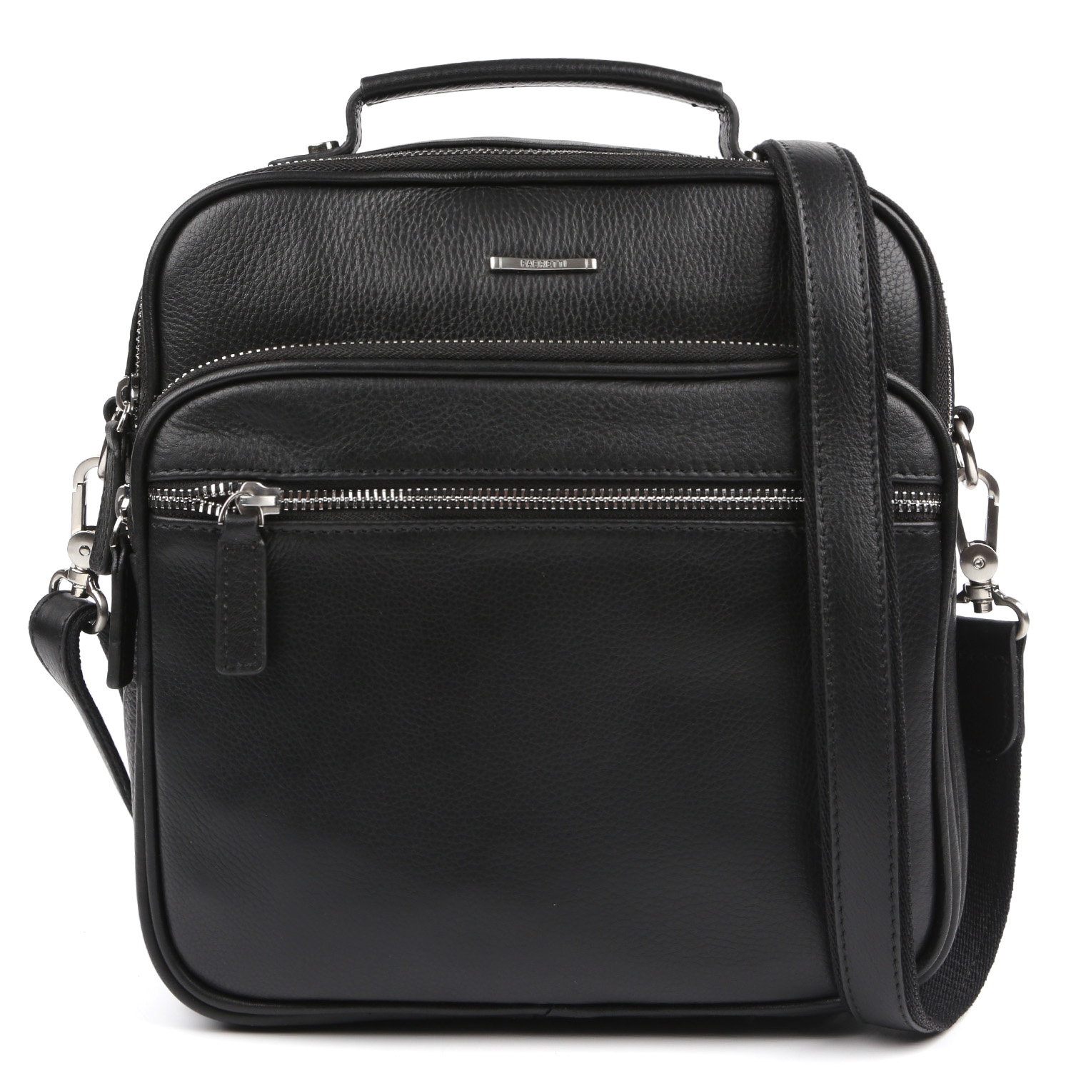 Вместительная мужская кросс-боди FABRETTI выполнена из натуральной зернистой кожи черного цвета. Сумка имеет 2 отделения, каждое из которых закрывается на полукруглую молнию. Внутри одного есть открытый боковой карман для мелочей, в другом есть карман на молнии. На лицевой стороне находятся 2 вместительных кармана на молнии, на тыльной стороне - карман быстрого доступа на молнии. Для большего удобства на сумке предусмотрена ручка. Плечевой ремень регулируется по длине, ширина - 2,5 см. Цвет фурнитуры - серебро.