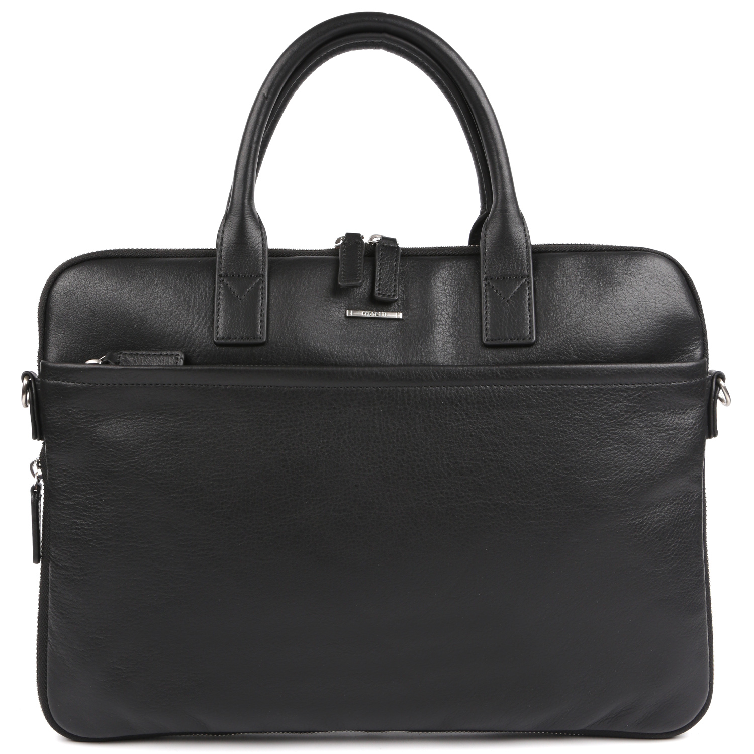 Стильная мужская сумка для документов FABRETTI выполнена из натуральной зернистой кожи черного цвета. Модель имеет две ручки и съемный плечевой ремень, длина которого регулируется, ширина - 2,5 см.