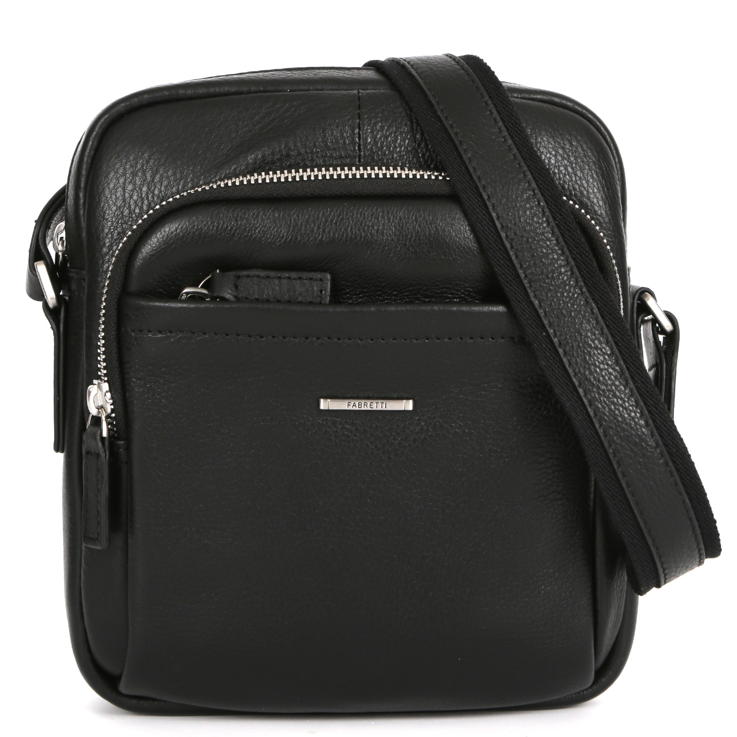 Стильная мужская кросс-боди FABRETTI выполнена из натуральной зернистой кожи черного цвета. Основное отделение закрывается на полукруглую молнию с кожаным поводком. Внутри есть карман на молнии для мелочей. На лицевой стороне расположены 2 кармана на молнии, на тыльной стороне также предусмотрен карман быстрого доступа на молнии. Плечевой ремень регулируется по длине, ширина - 3,5 см. Цвет фурнитуры - серебро.