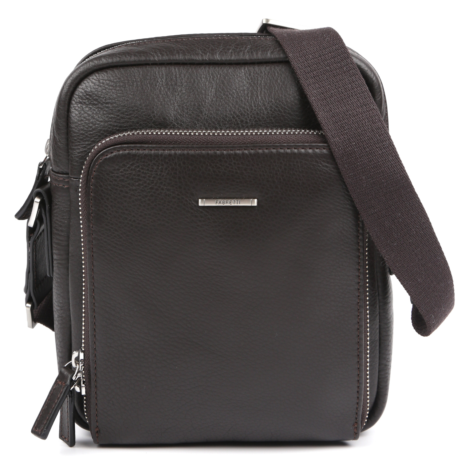 Стильная мужская кросс-боди FABRETTI выполнена из натуральной зернистой кожи в темно-коричневом оттенке. Основное отделение закрывается на полукруглую молнию с кожаным поводком. Внутри есть 2 боковых кармана для мелочей: открытый и на молнии. На лицевой стороне расположен карман на молнии, на тыльной стороне также предусмотрен карман быстрого доступа на молнии. Плечевой ремень регулируется по длине, ширина - 3,5 см. Цвет фурнитуры - серебро.