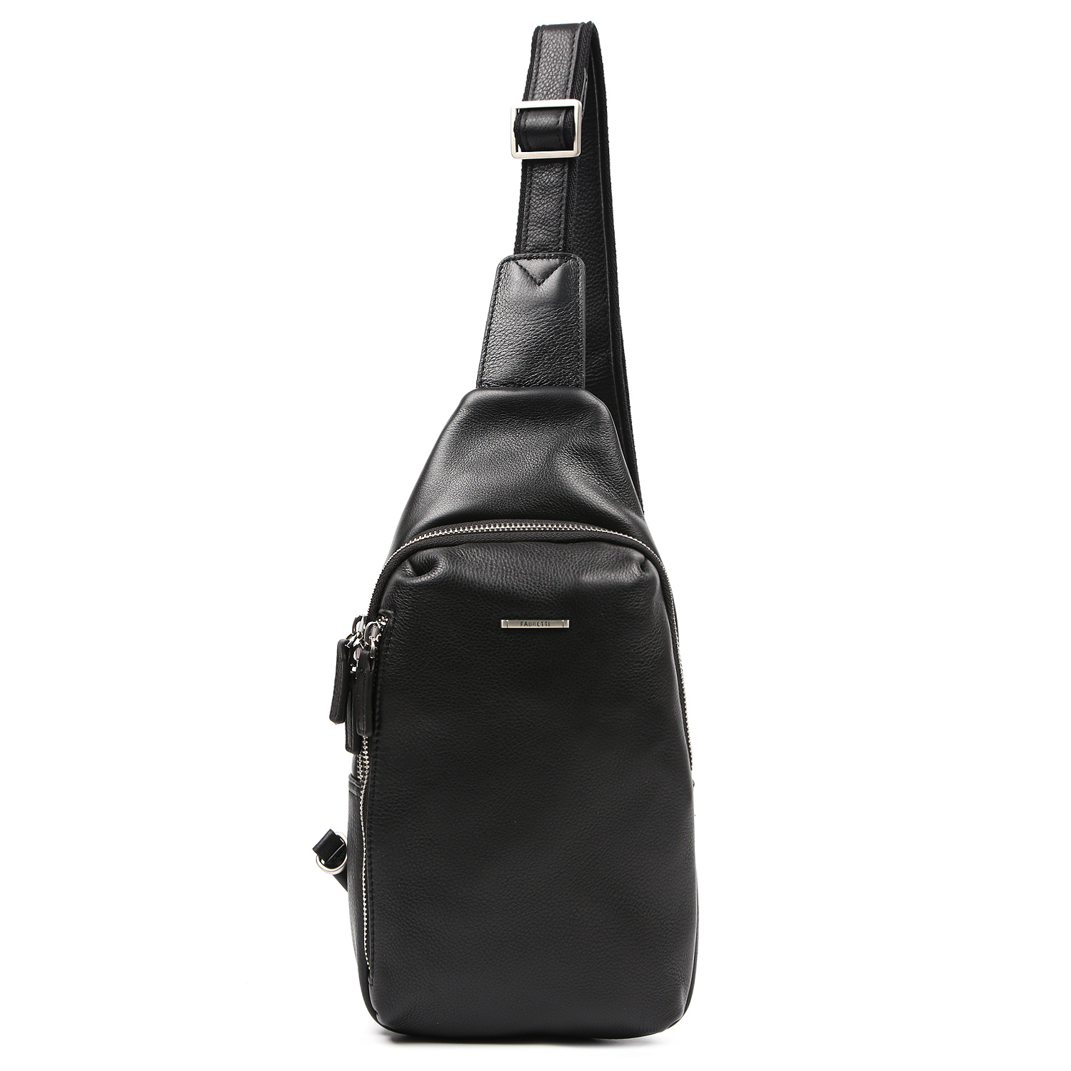 Стильная компактная сумка-слинг FABRETTI выполнена из натуральной зернистой кожи в черном цвете. Основное отделение закрывается на полукруглую молнию с 2 бегунками. Внутри 2 боковых кармана для мелочей: открытый и на молнии. На лицевой стороне расположен вертикальный карман на молнии. На тыльной стороне также предусмотрен карман быстрого доступа на молнии. Длина плечевого ремня регулируется, ширина - 3 см. Продуманная система крепления плечевого ремня позволяет носить сумку на плече или через плечо. Цвет фурнитуры - серебро.