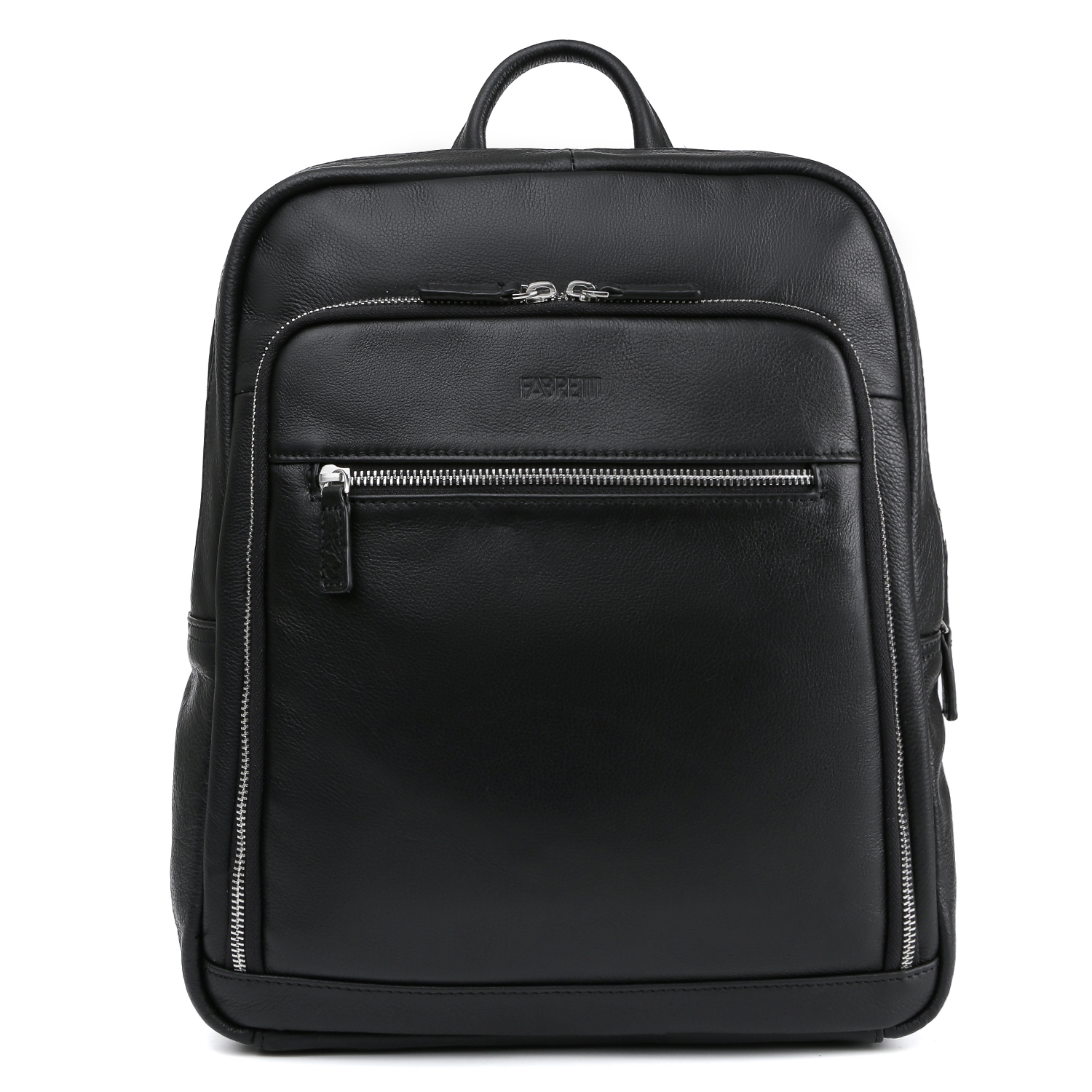 Компактный мужской кожаный рюкзак итальянского бренда FABRETTI выполнен из натуральной кожи зернистой фактуры в черном цвете. У модели два отделения, закрывающиеся на полукруглую металлическую молнию с двумя бегунками.