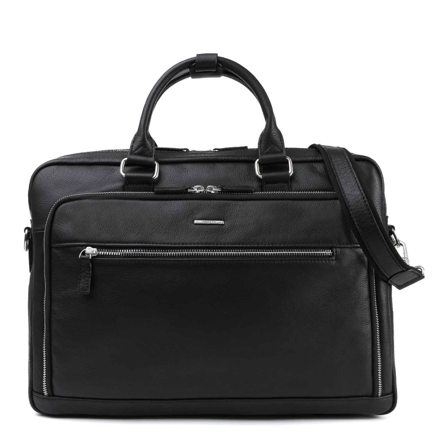 Классическая мужская сумка для документов итальянского бренда FABRETTI выполнена из натуральной зернистой кожи черного цвета. Модель имеет две ручки и съемный регулируемый плечевой ремень, ширина - 3 см. Текстильный ремень отделан широкой кожаной вставкой по длине. Ручки могут быть зафиксированы вместе съемным хлястиком с кнопкой.